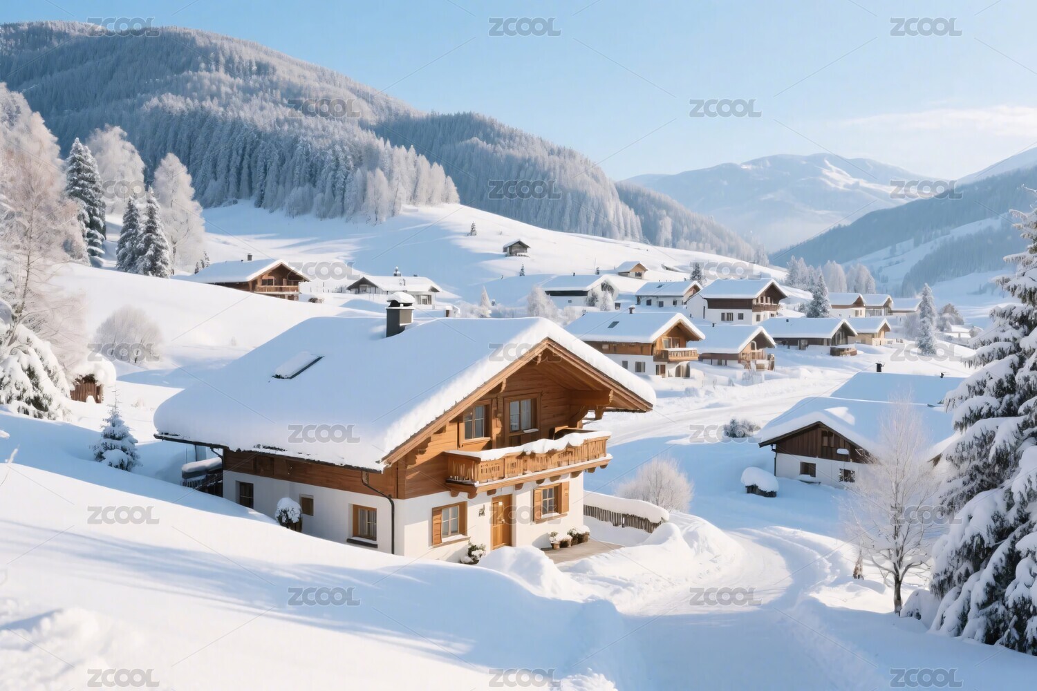 雪山木屋冬日雪景