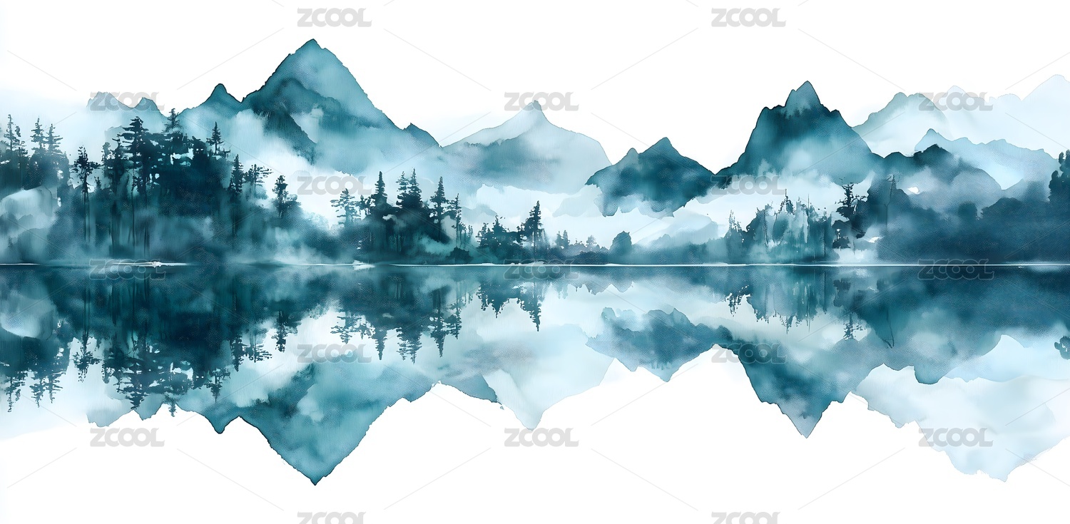 水彩风格山峦湖泊倒影风景绘画,静谧而悠远