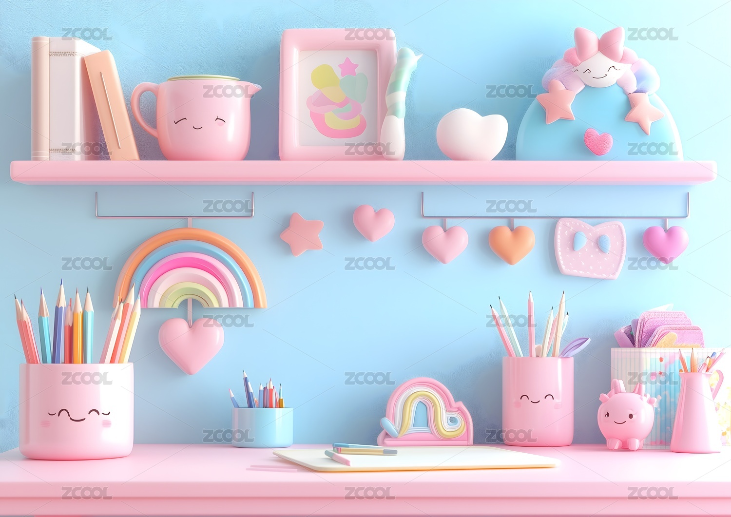 桌子,学习,卡通,儿童,铅笔,笔,书,彩虹,爱心,云朵