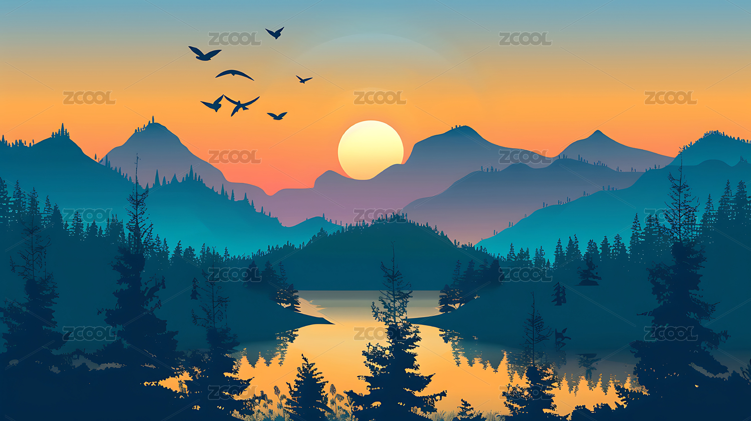 风景,山水,背景,插画,自然,日落,湖面,山脉,天空,宁静