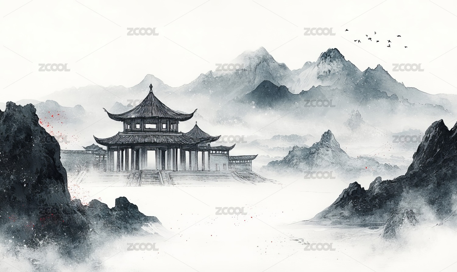中秋节,山,水,月亮,意境,地形,河流,户外,水墨画,高山