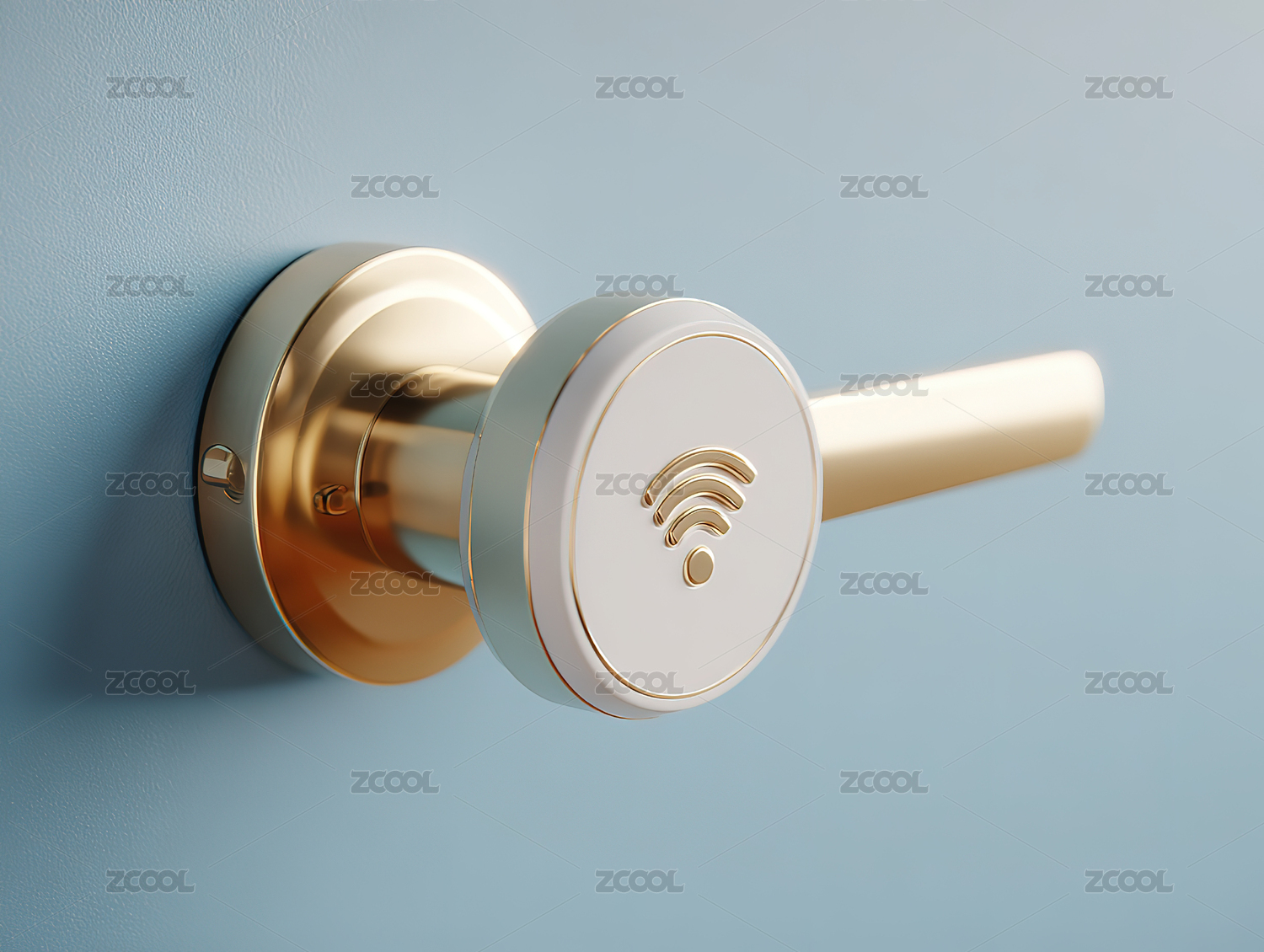 智能门锁特写金色把手与Wi-Fi标志