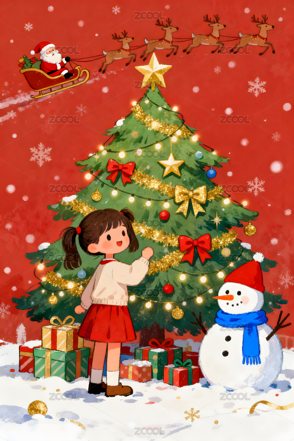 圣诞节 礼物 圣诞树 拐杖 女生雪人