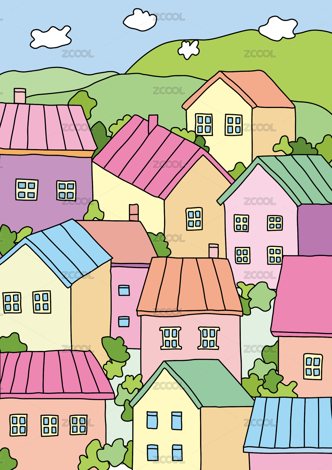 欧式卡通城镇建筑扁平风格插画背景壁纸