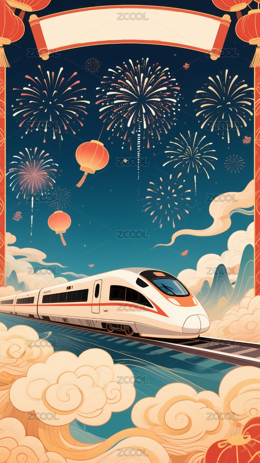 红色喜庆烟花绽放的背景下高铁动车春运素材