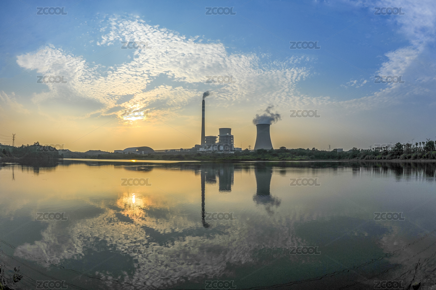 日落之后的核电站,黄昏景观与大烟囱,原发电厂冷却塔顶部