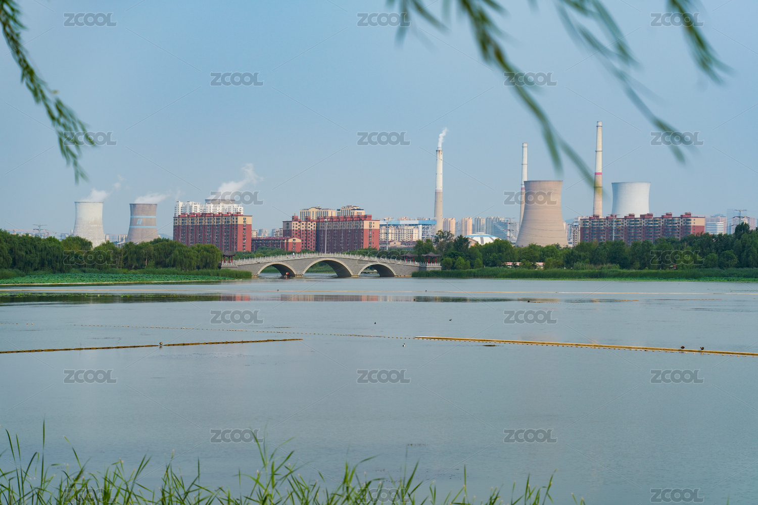 山东济南华山湖对面的住宅楼与电厂烟筒