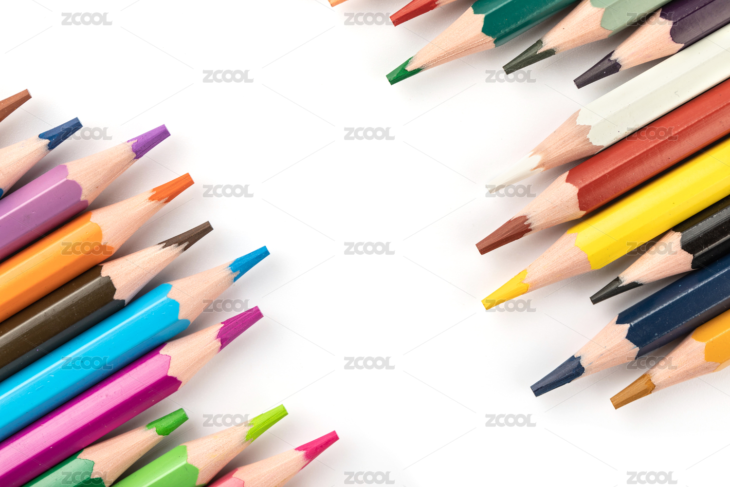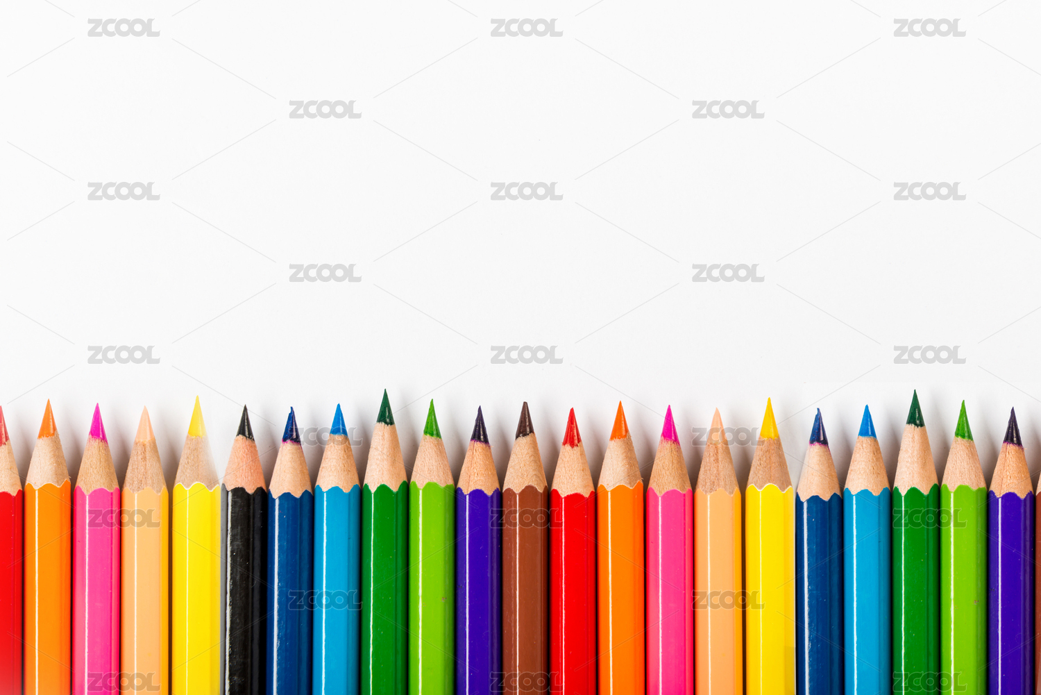 白底上一排彩色铅笔按一定的弧线整齐摆放