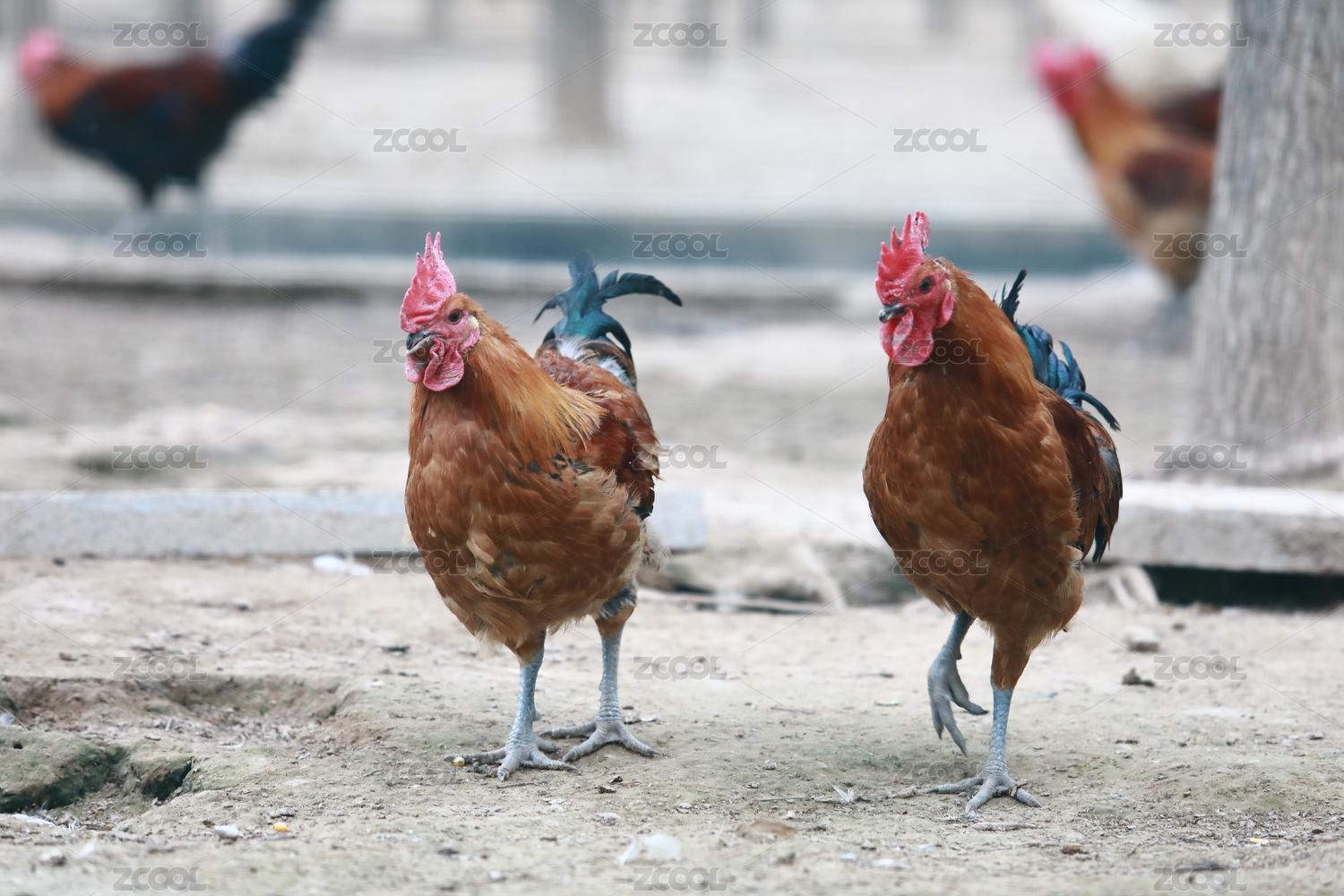 鸡舍里隔着铁丝网在稻壳上休息的母鸡