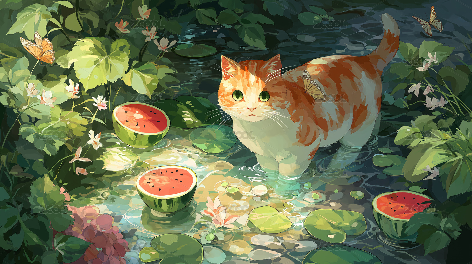猫咪,蝴蝶,鱼,猫,小动物,动物,水面,荷叶,睡莲,夏天