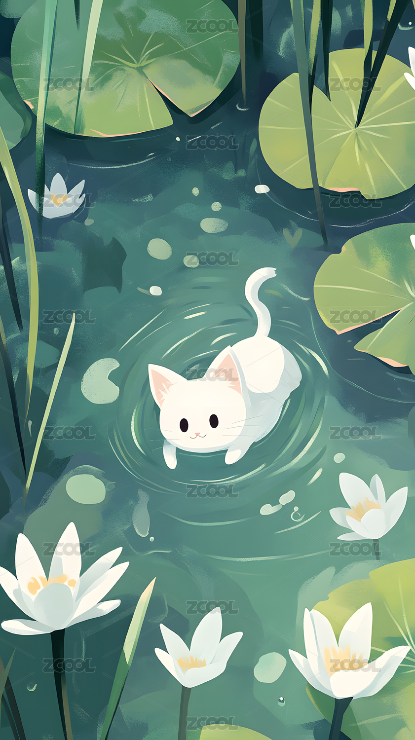 猫咪在睡莲池塘里游泳