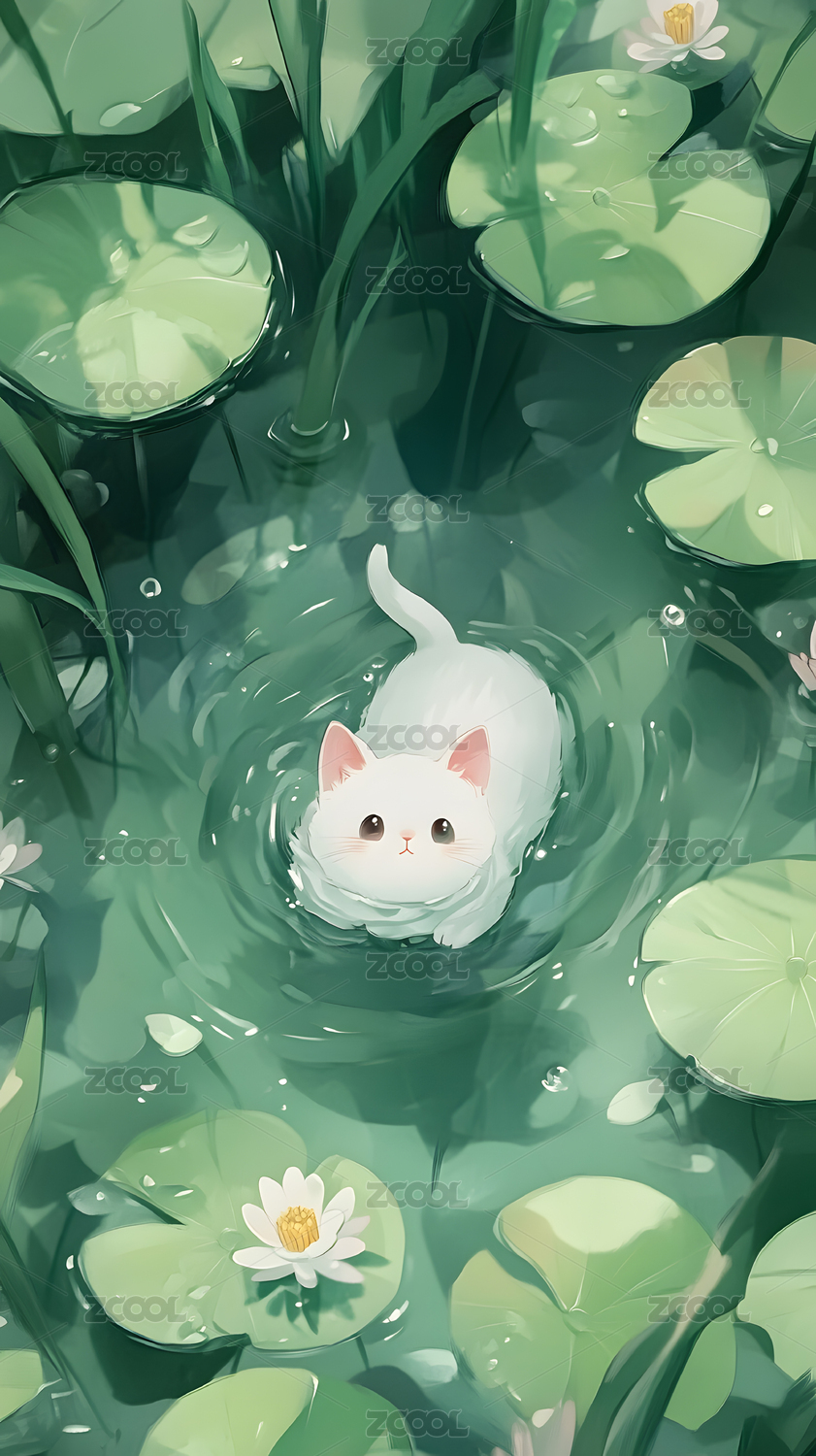 可爱白猫水中嬉戏莲叶田田