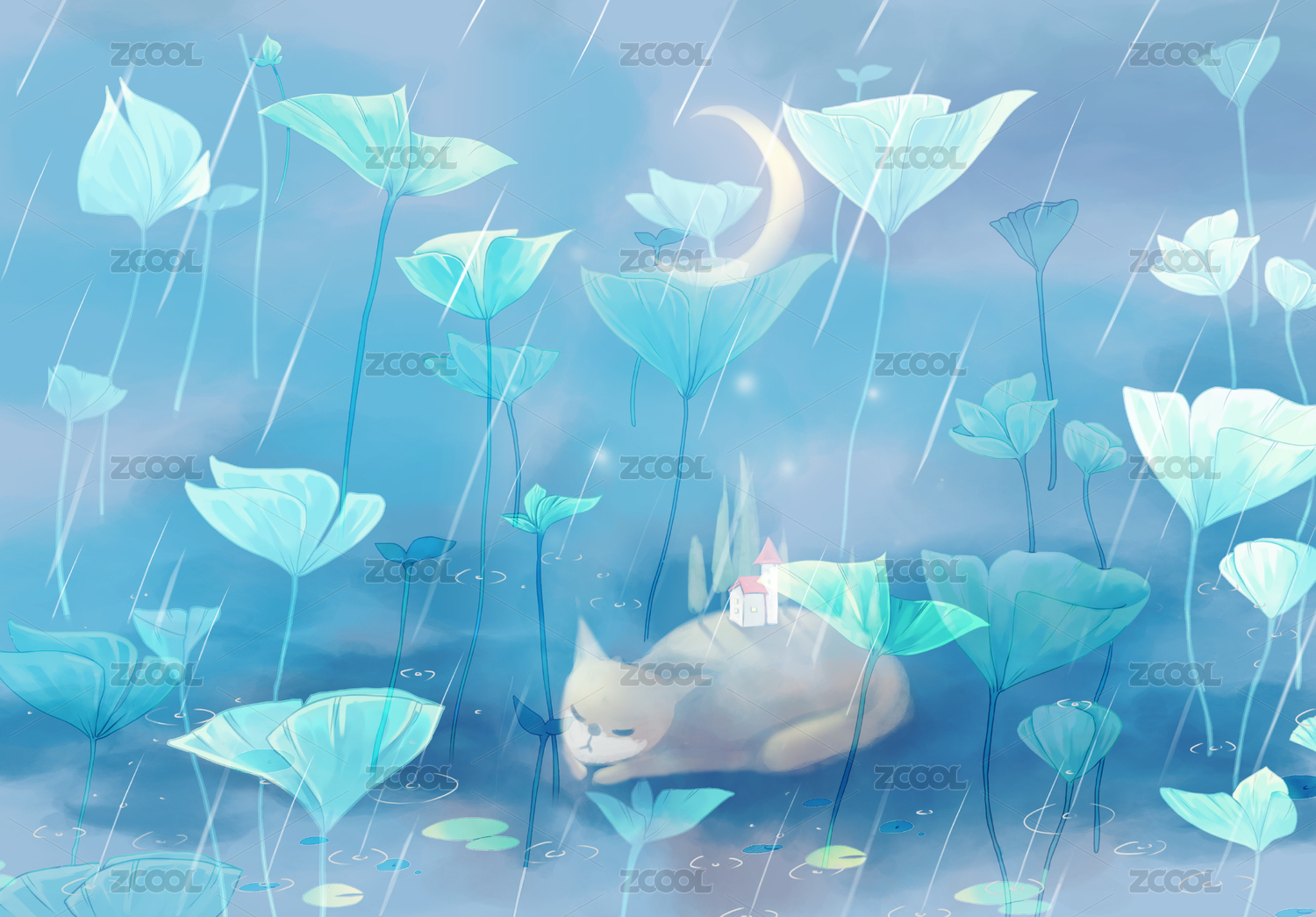 猫在荷塘边发现了纸船,板绘