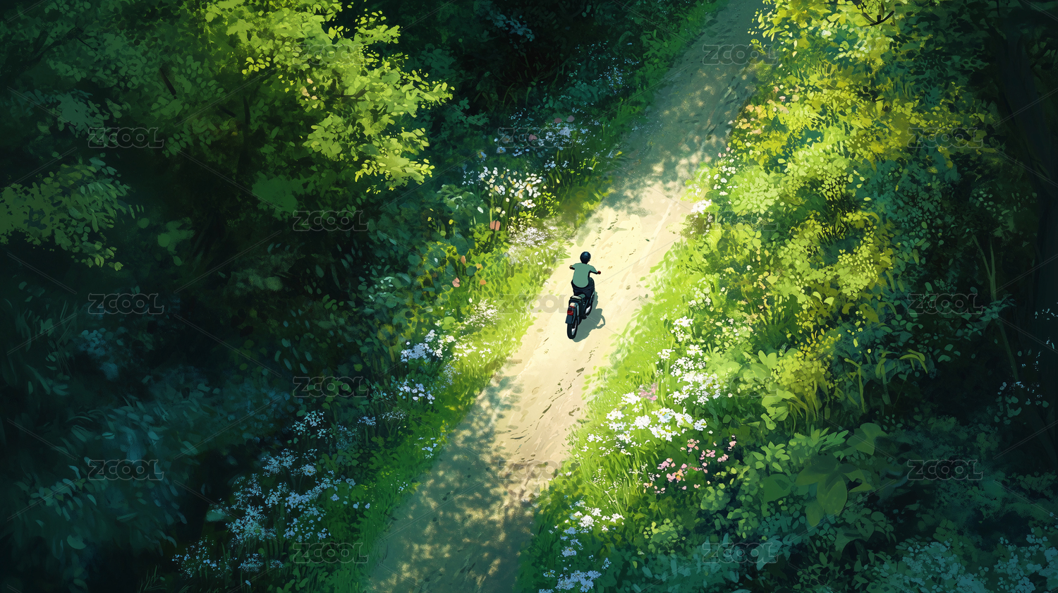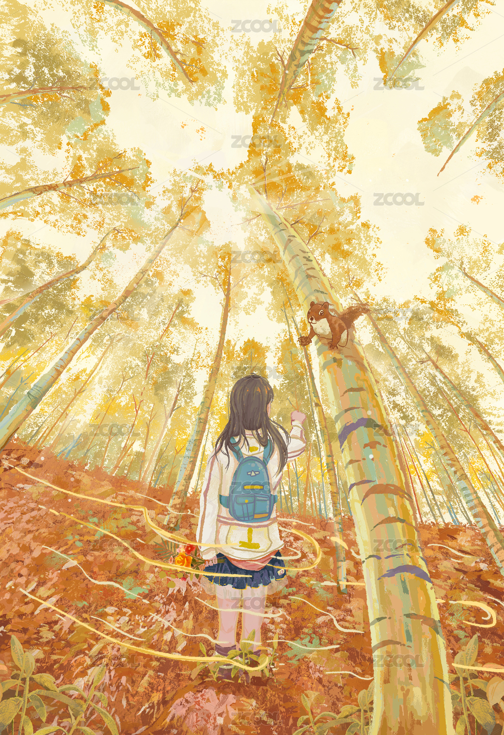 插画插图动漫秋季落叶草地树林可爱女孩背景