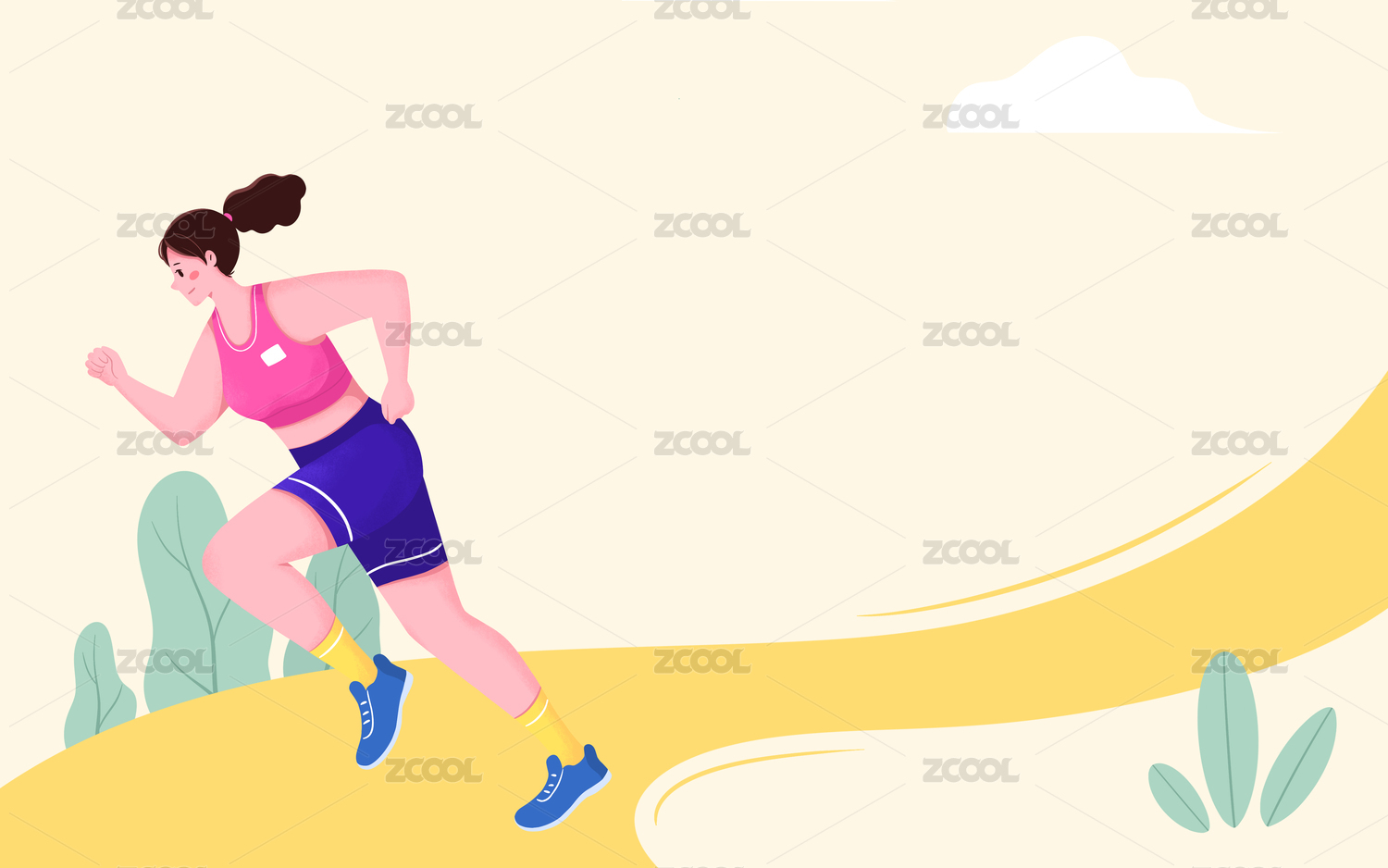 一个健美女性在花草丛间轻盈的跑步做健身运动--扁平化插画