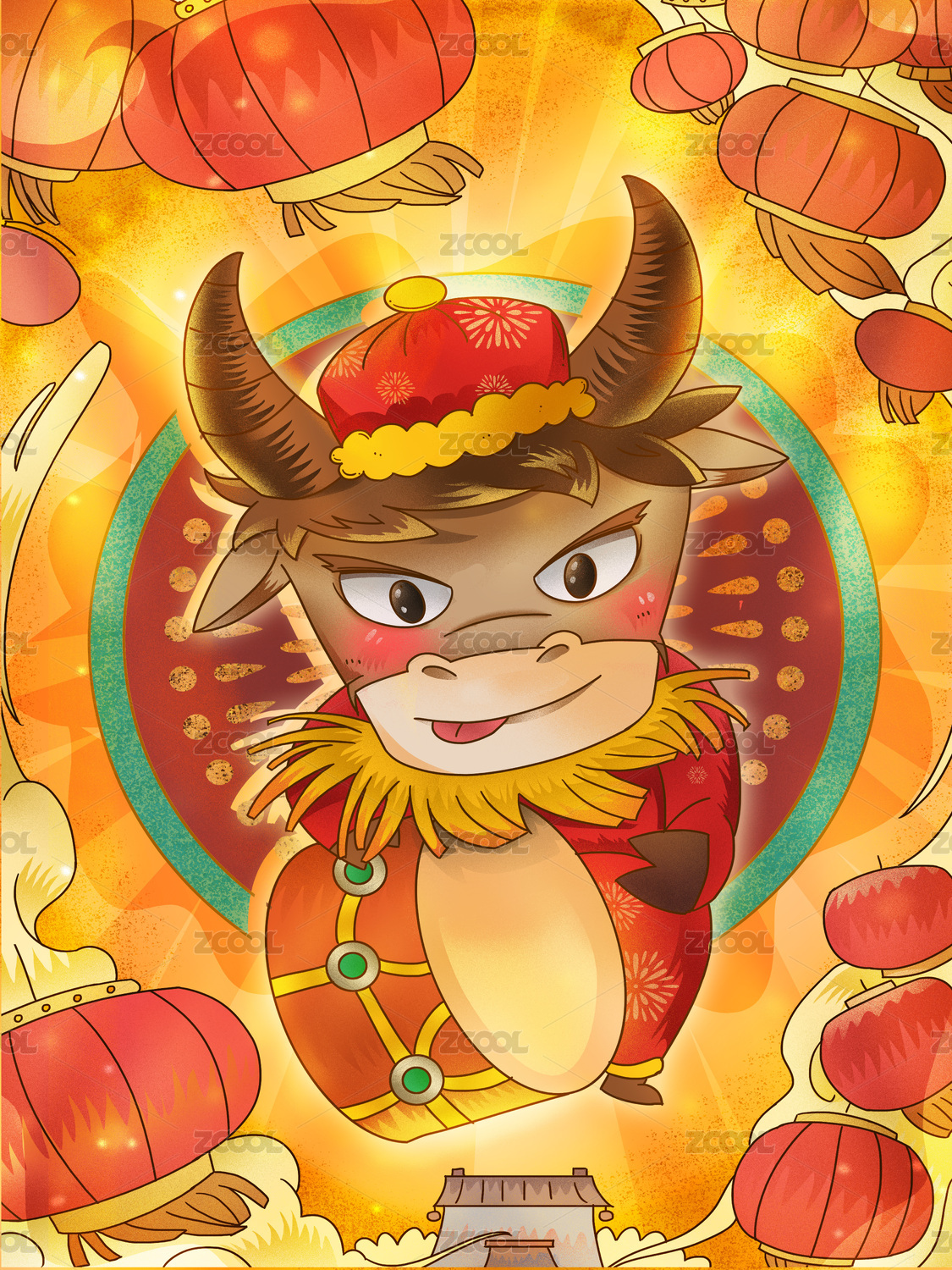 国潮牛年可爱牛牛IP形象矢量插画背景