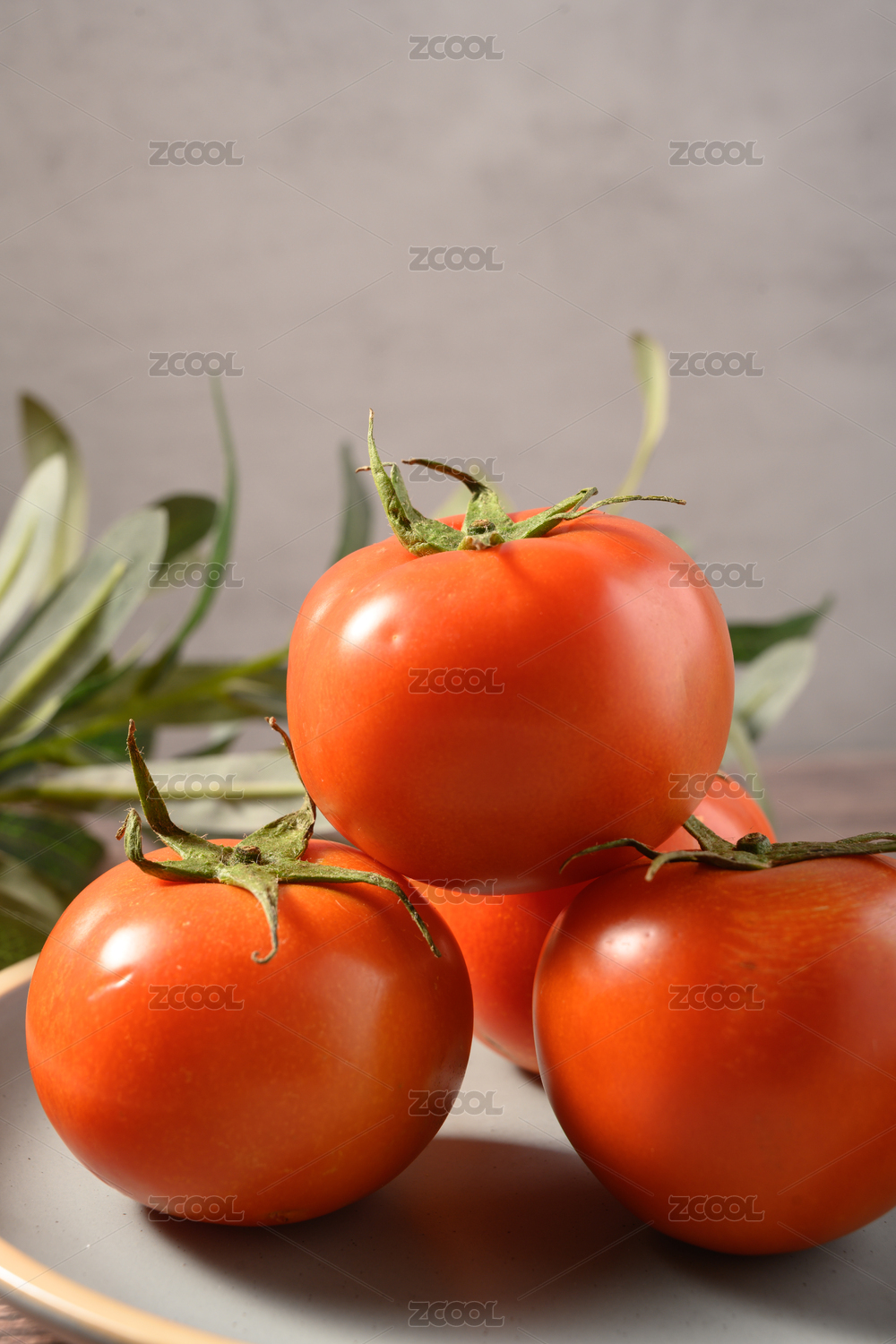 桌面上的青色盘子里的美味可口的番茄