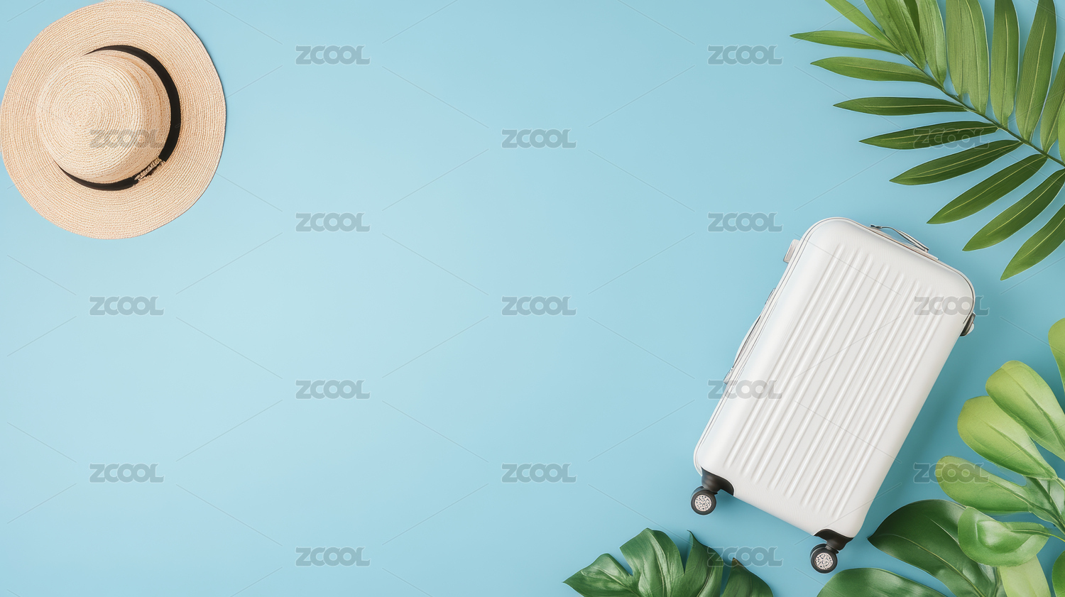 旅游主题纯色背景下的旅行箱、草帽和飞机