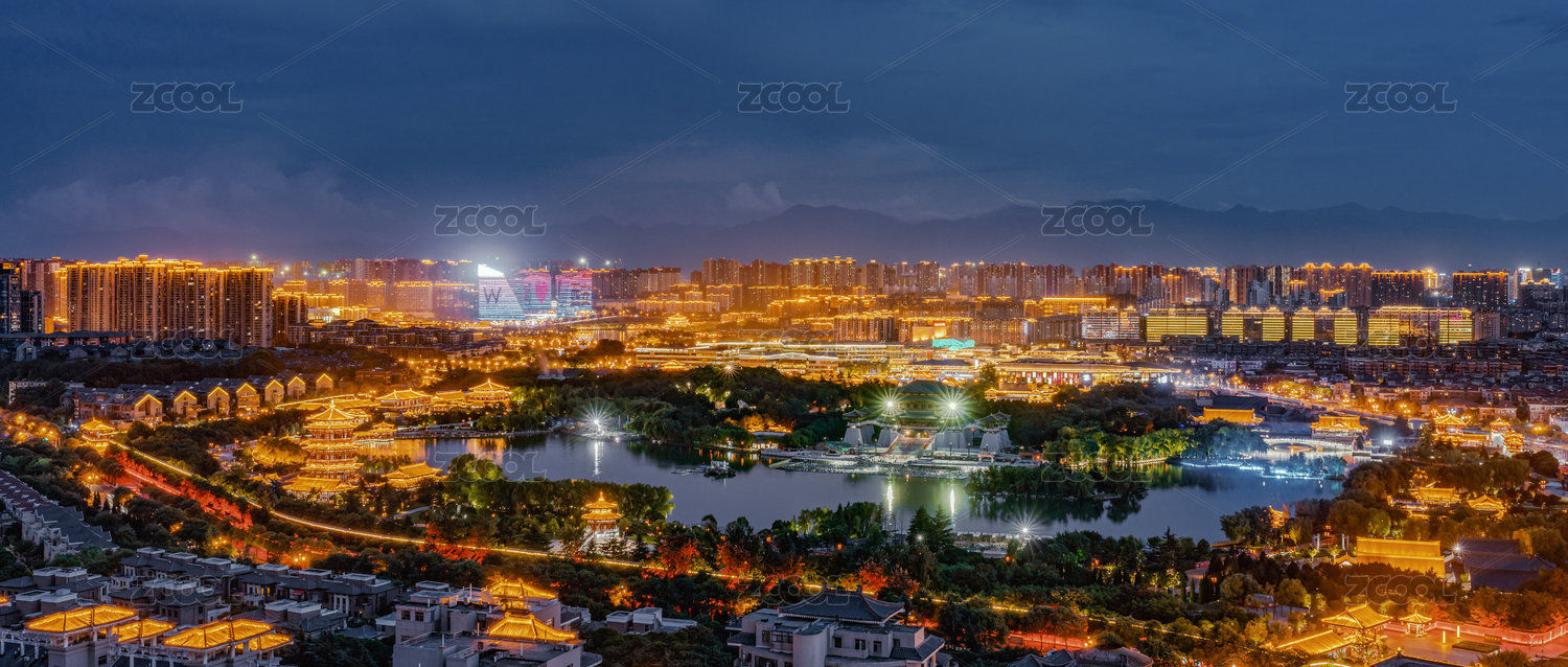 中国陕西省西安市曲江池航拍夜景城市风光