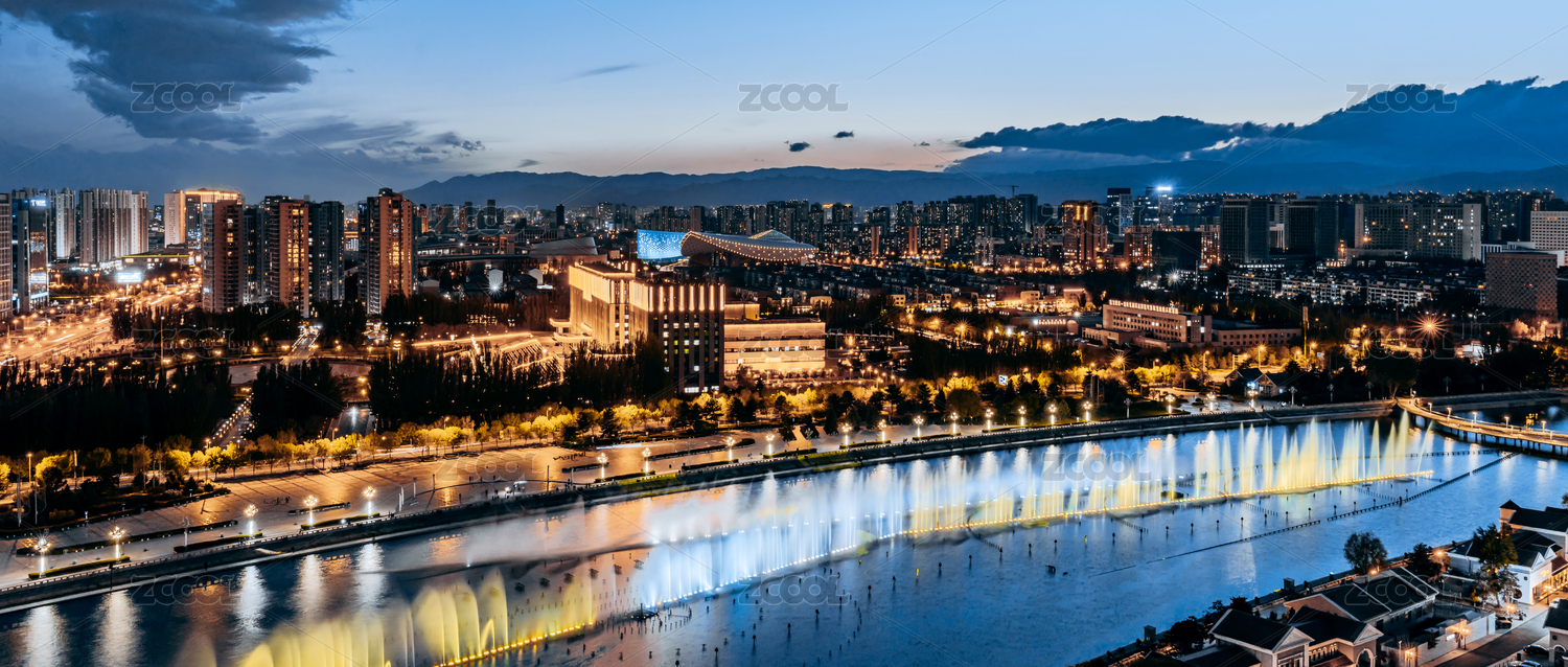 喷泉,城市,呼和浩特,内蒙古,高视角,天际线,夜景,建筑,彩霞,广场