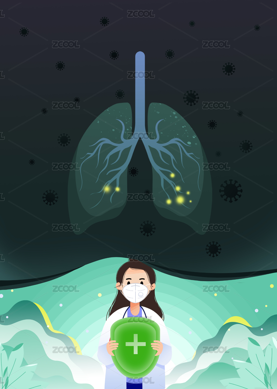 穿防护服的医护人员对肺部病毒解说插画