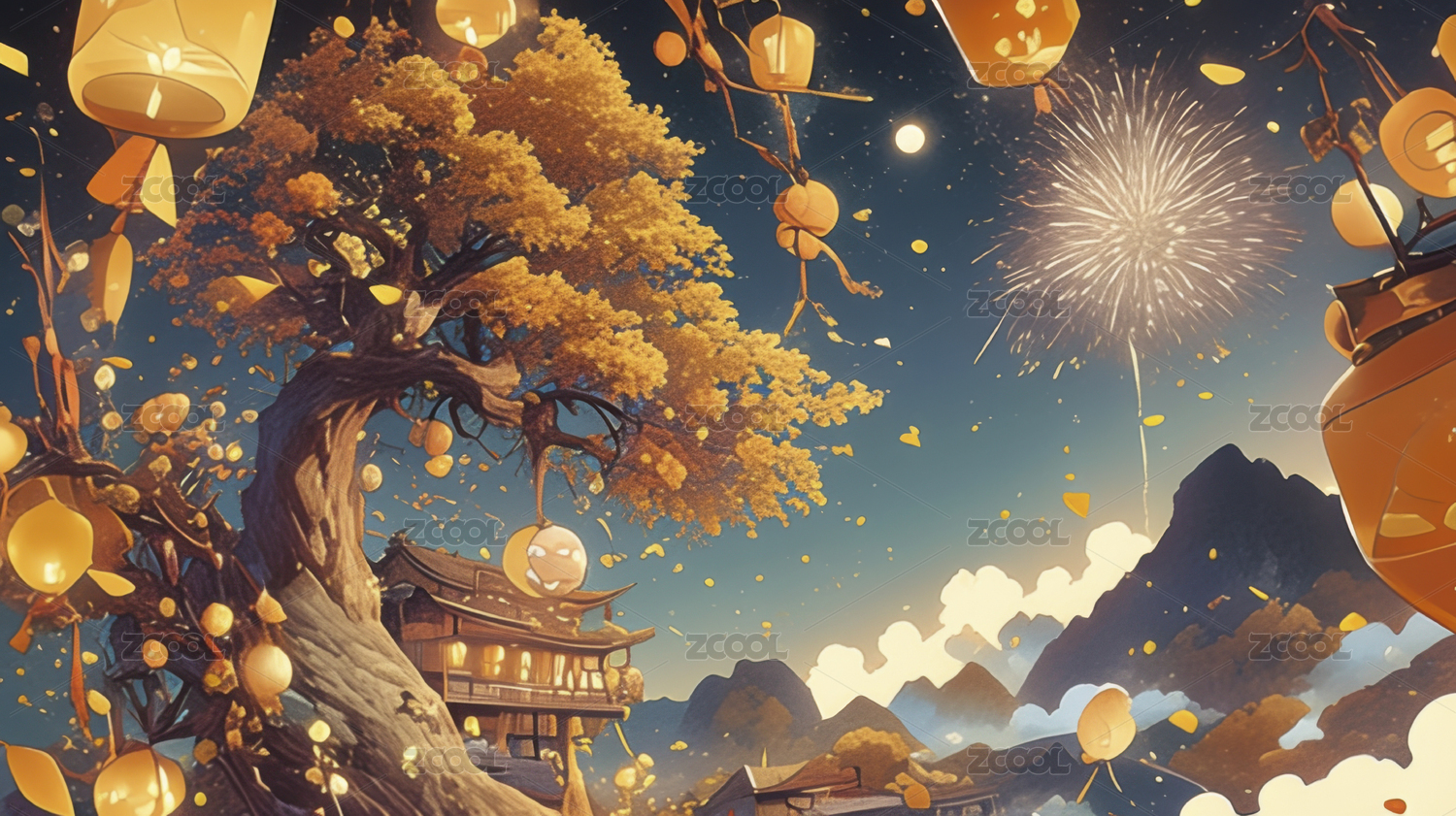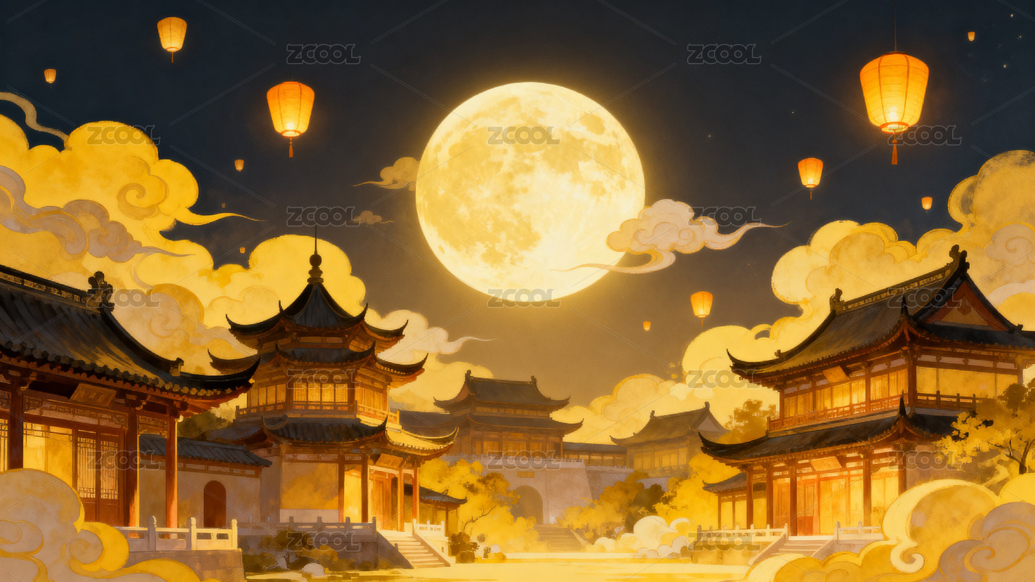 满月,背景,灯笼,中秋节,月亮,夜晚,插画,天空,自然,建筑