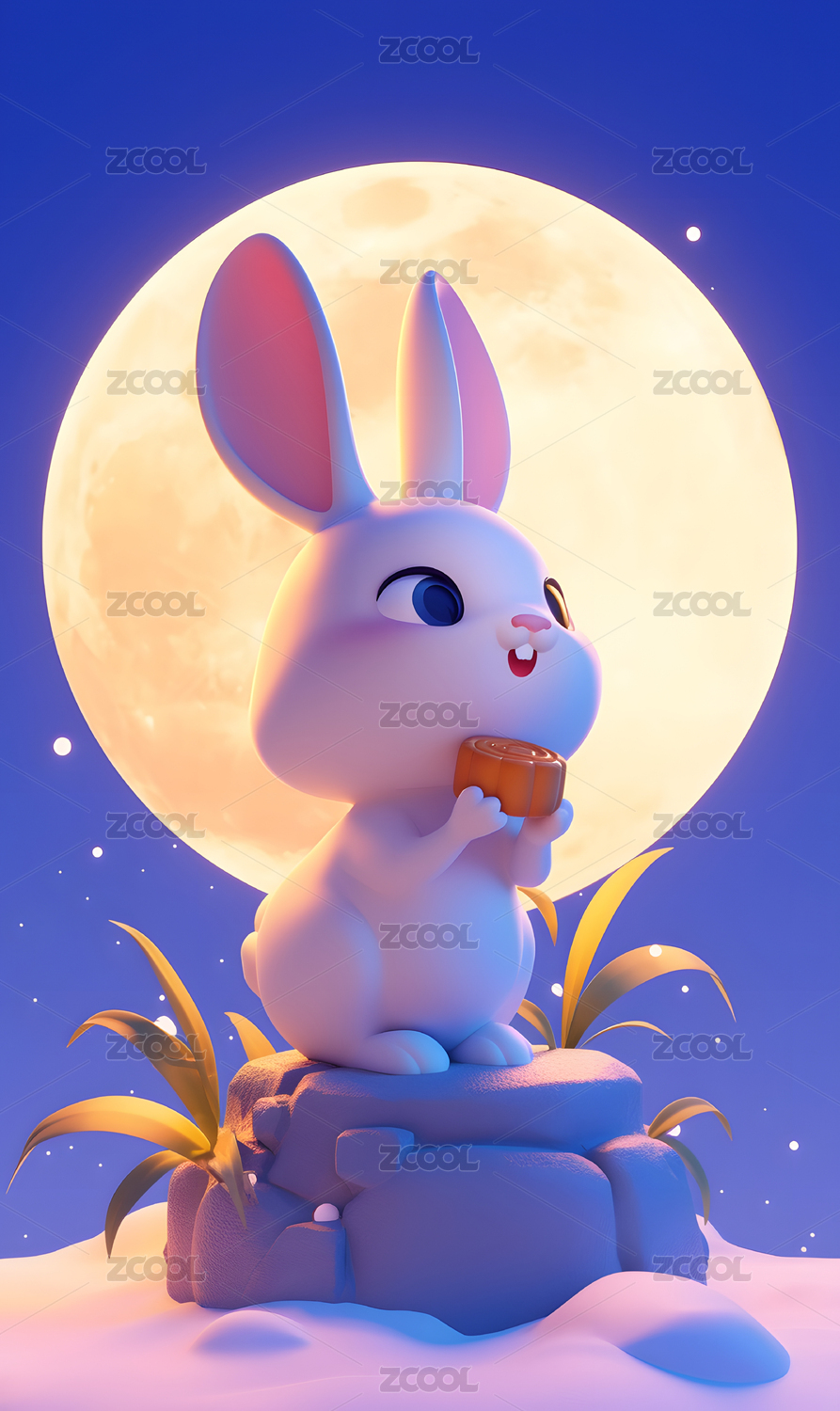 中秋节夜晚玉兔手拿灯笼坐在月饼上
