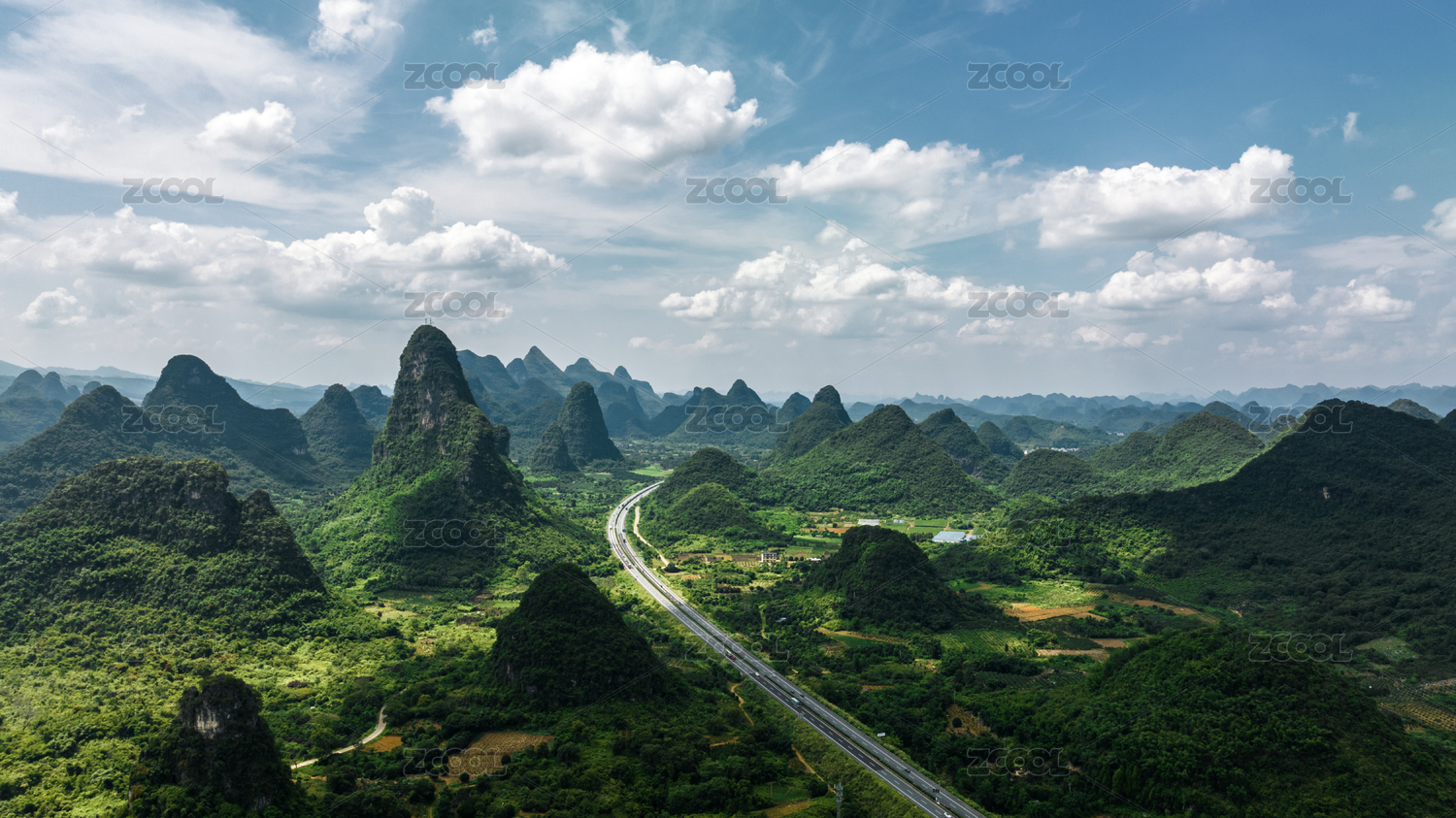 蓝天白云阳光下桂林喀斯特山谷中的高速公路