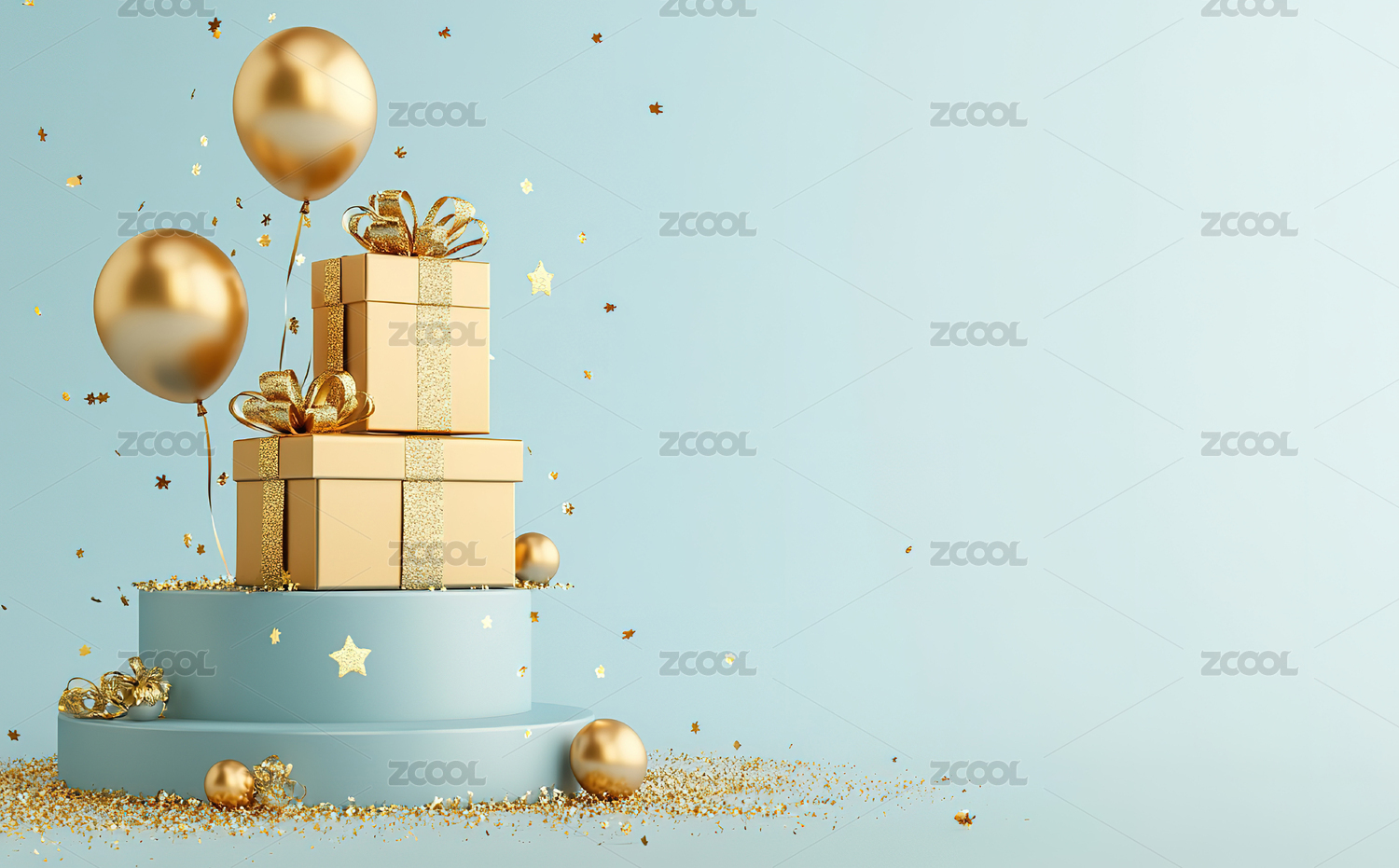 金色背景上的白色礼盒和金色气球