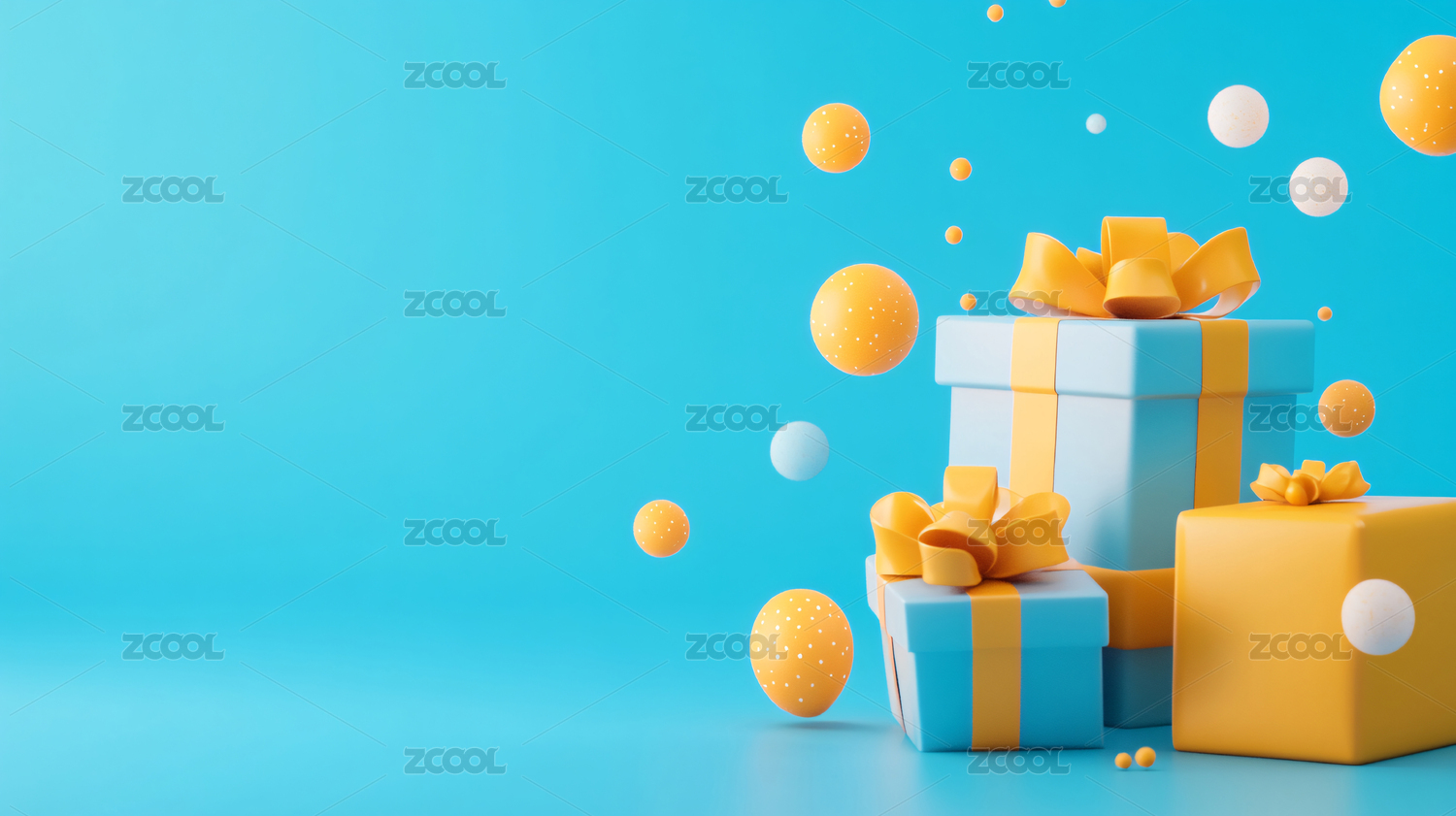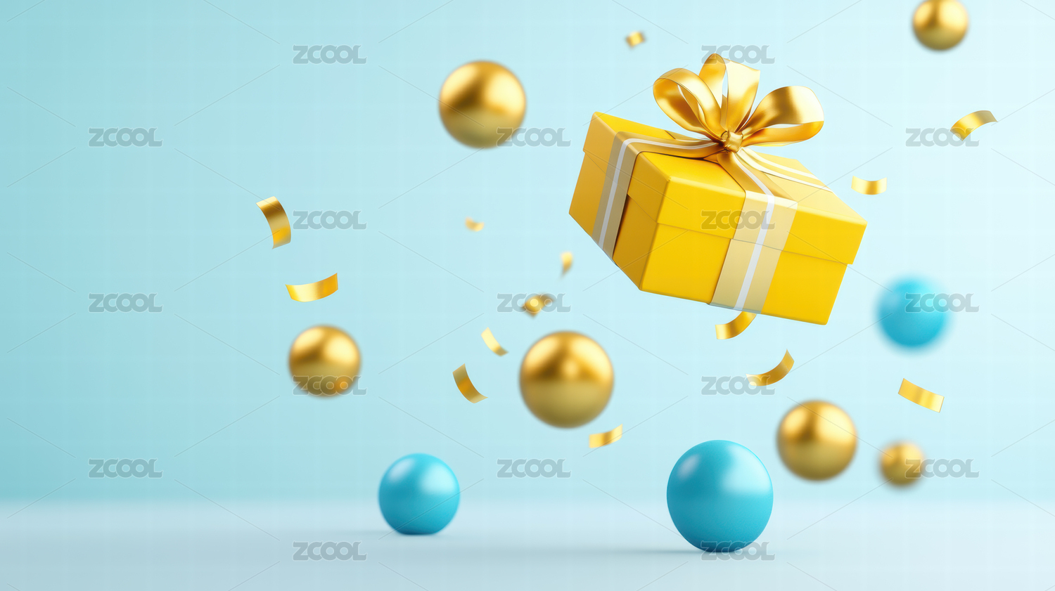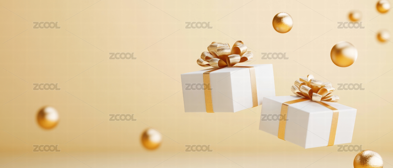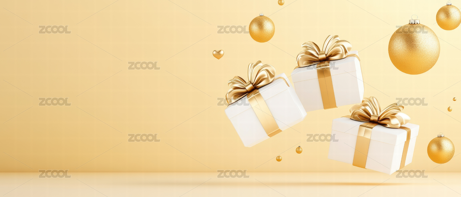 悬浮的黄色礼物盒和金色装饰球