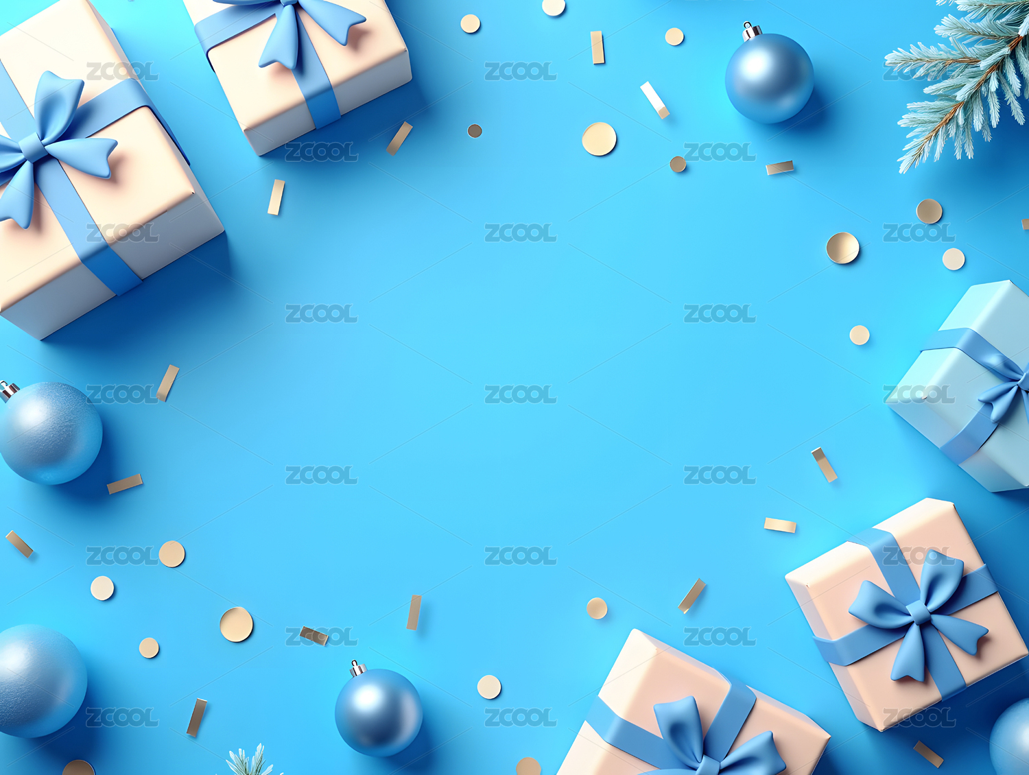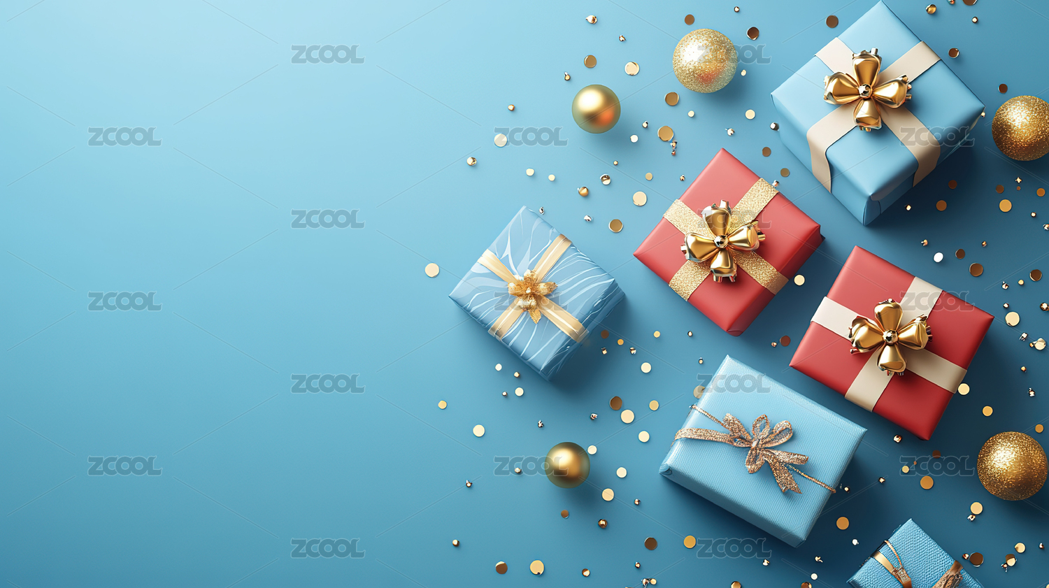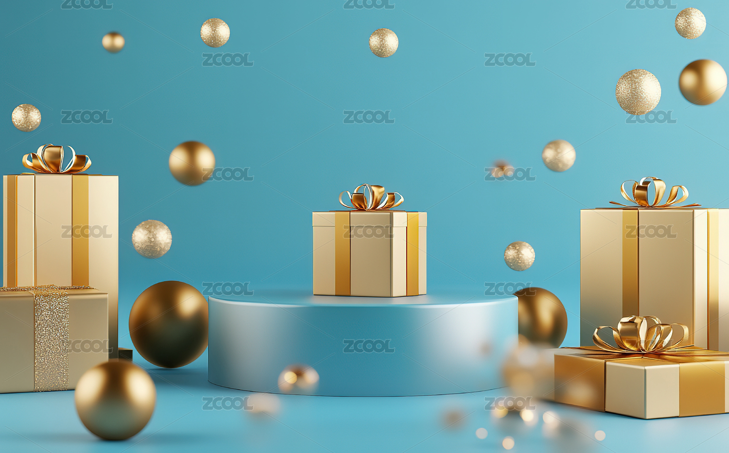 金色礼盒与蓝色装饰球