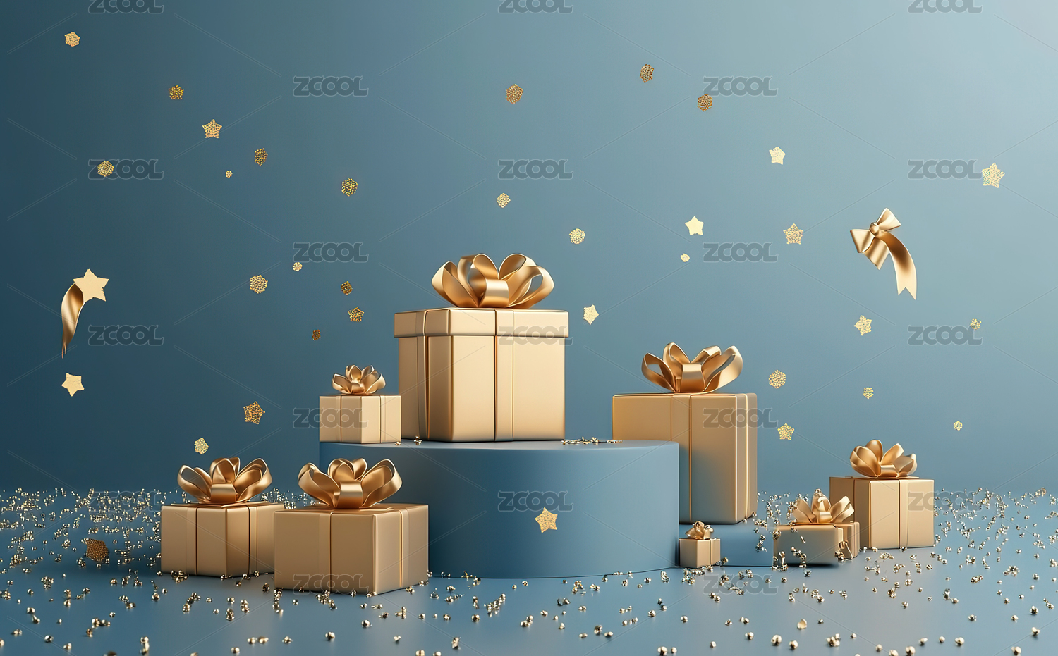 金色和蓝色的节日礼物堆叠