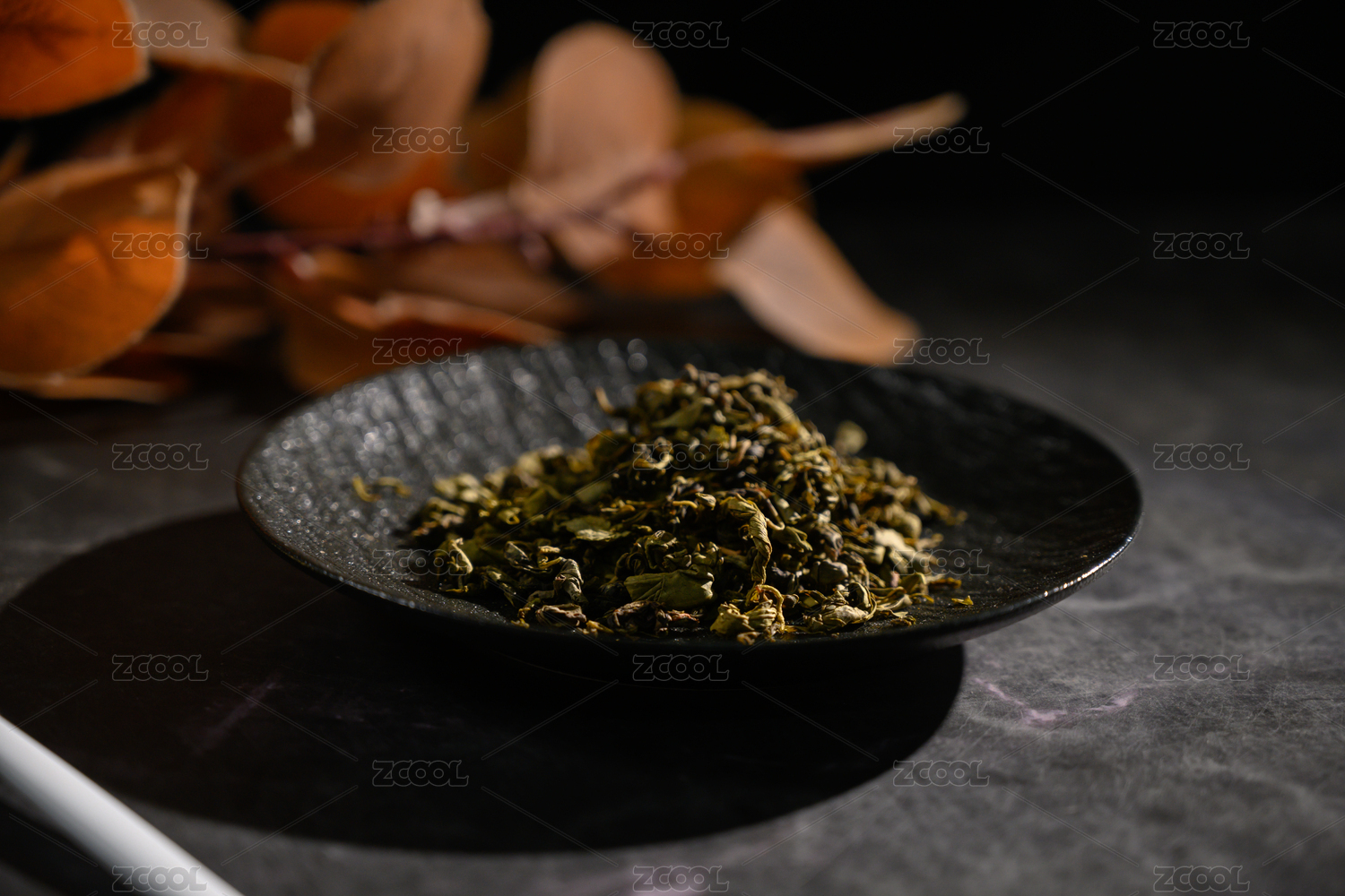 桌面上的盘子里的干爽的绞股蓝