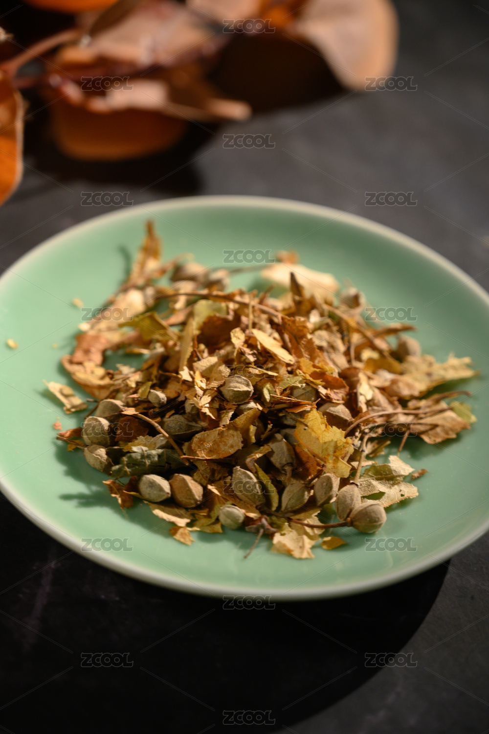 桌面上的盘子里的干爽的秦皮