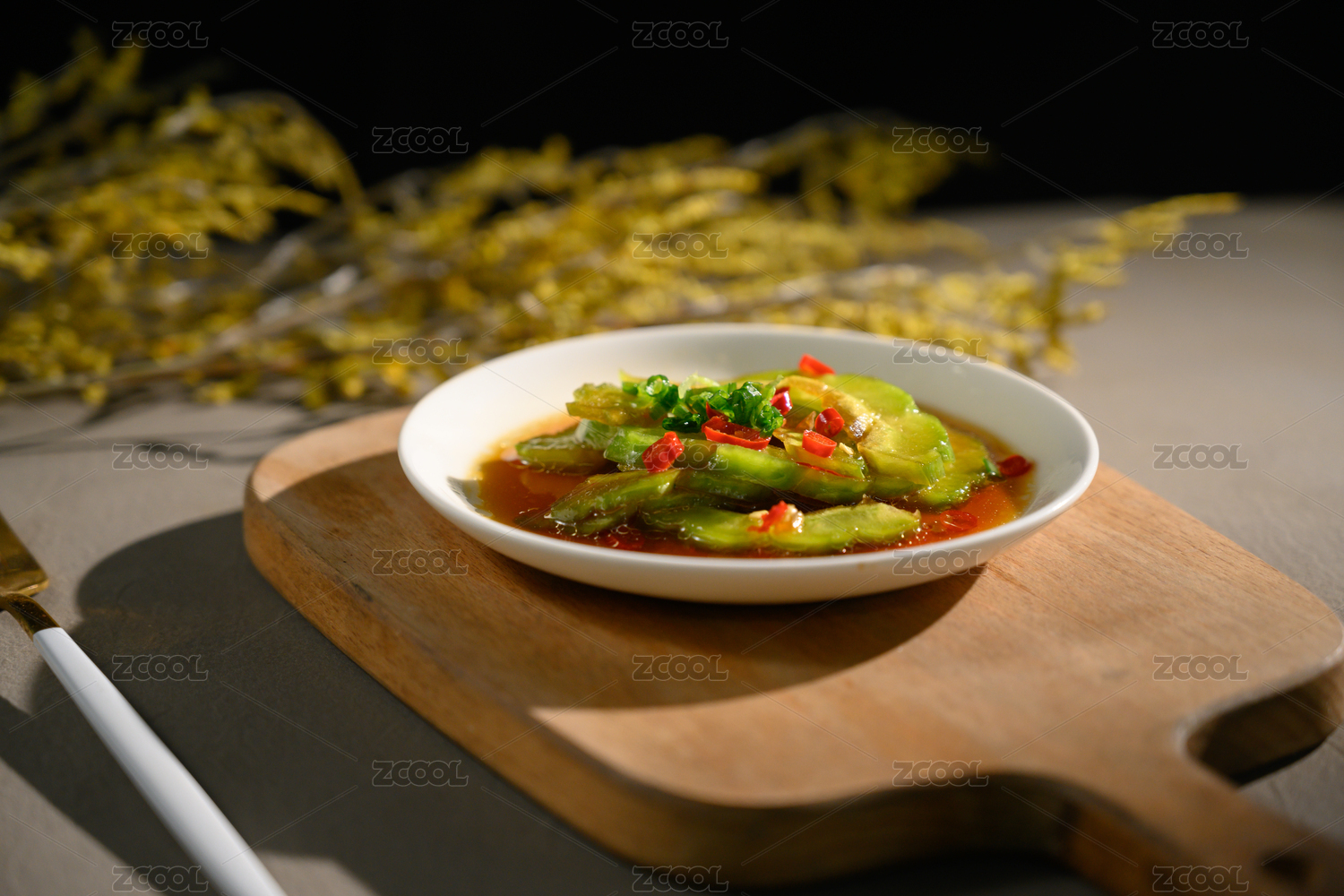 桌面上的盘子里的美味可口的凉拌苦瓜