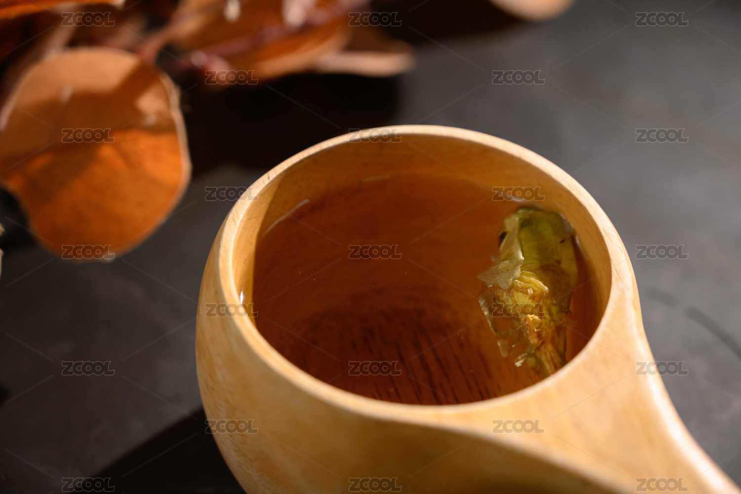 桌面上的杯子里的甘甜可口的金盏菊花茶