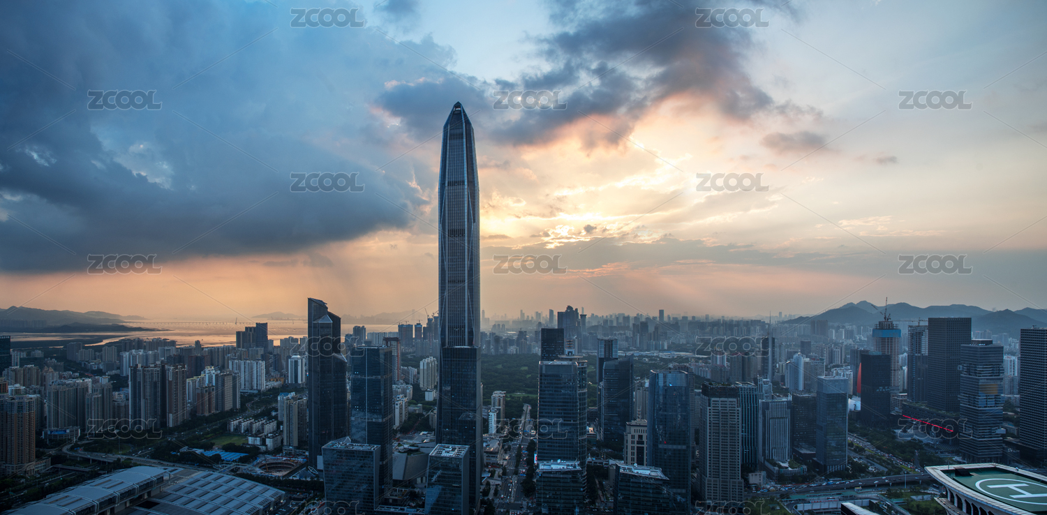 鸟瞰中国广东省深圳平安大厦天际线建筑群高楼大厦夕阳黄昏风光