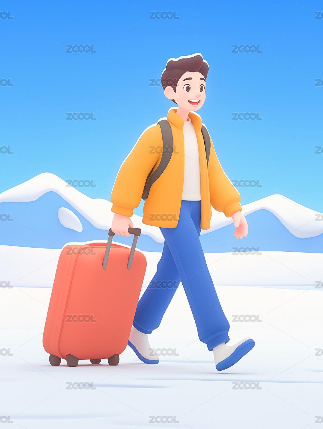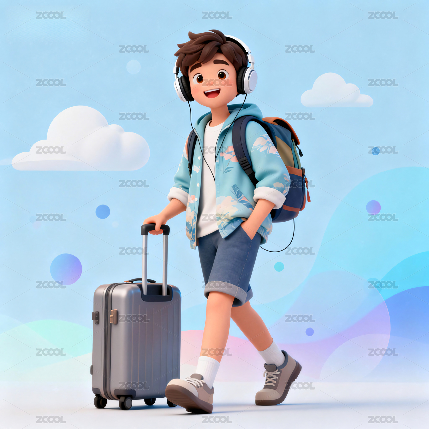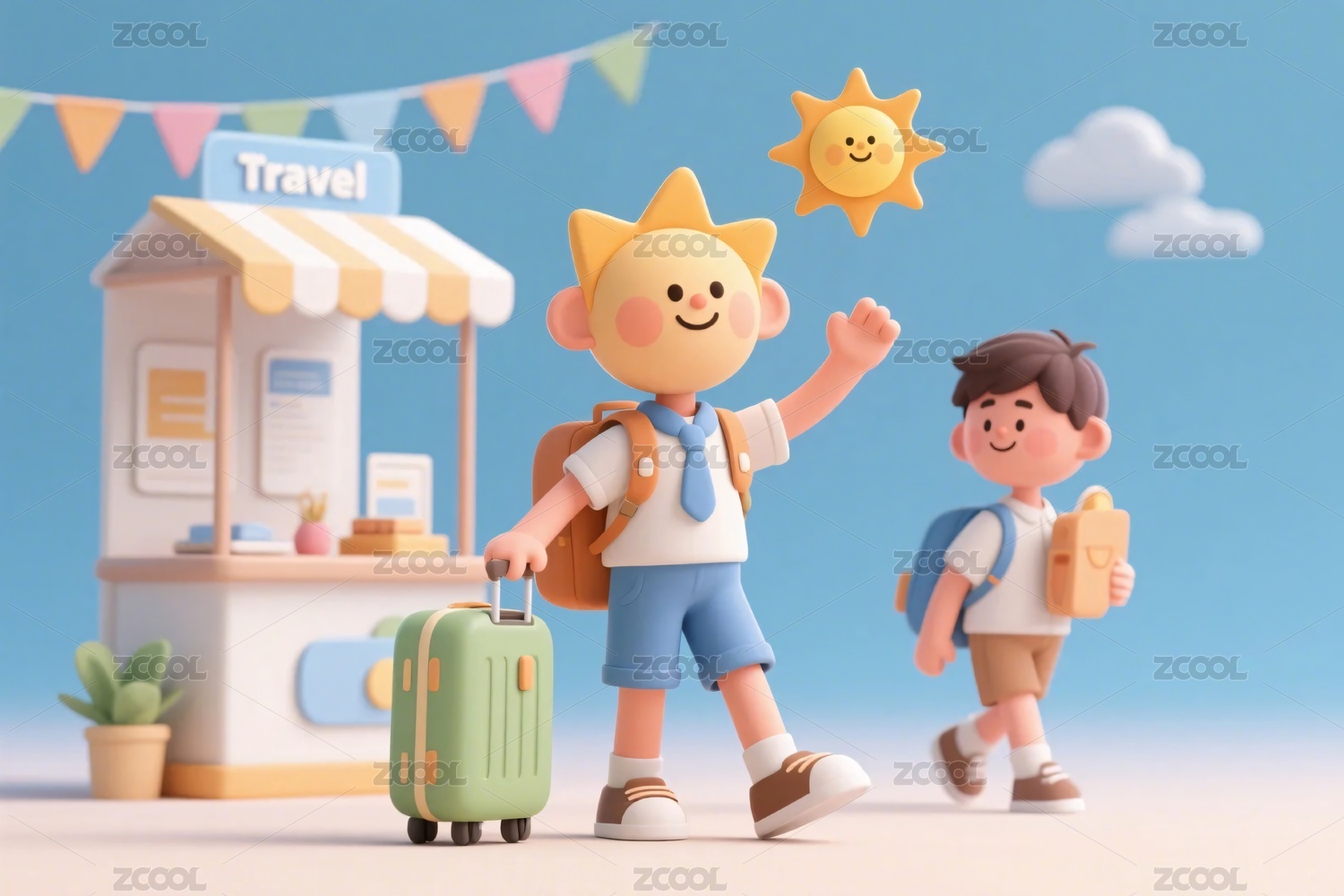 AIGC202404,3D立体风,行李箱,出行,旅行,旅游,户外,插画,插图,男孩