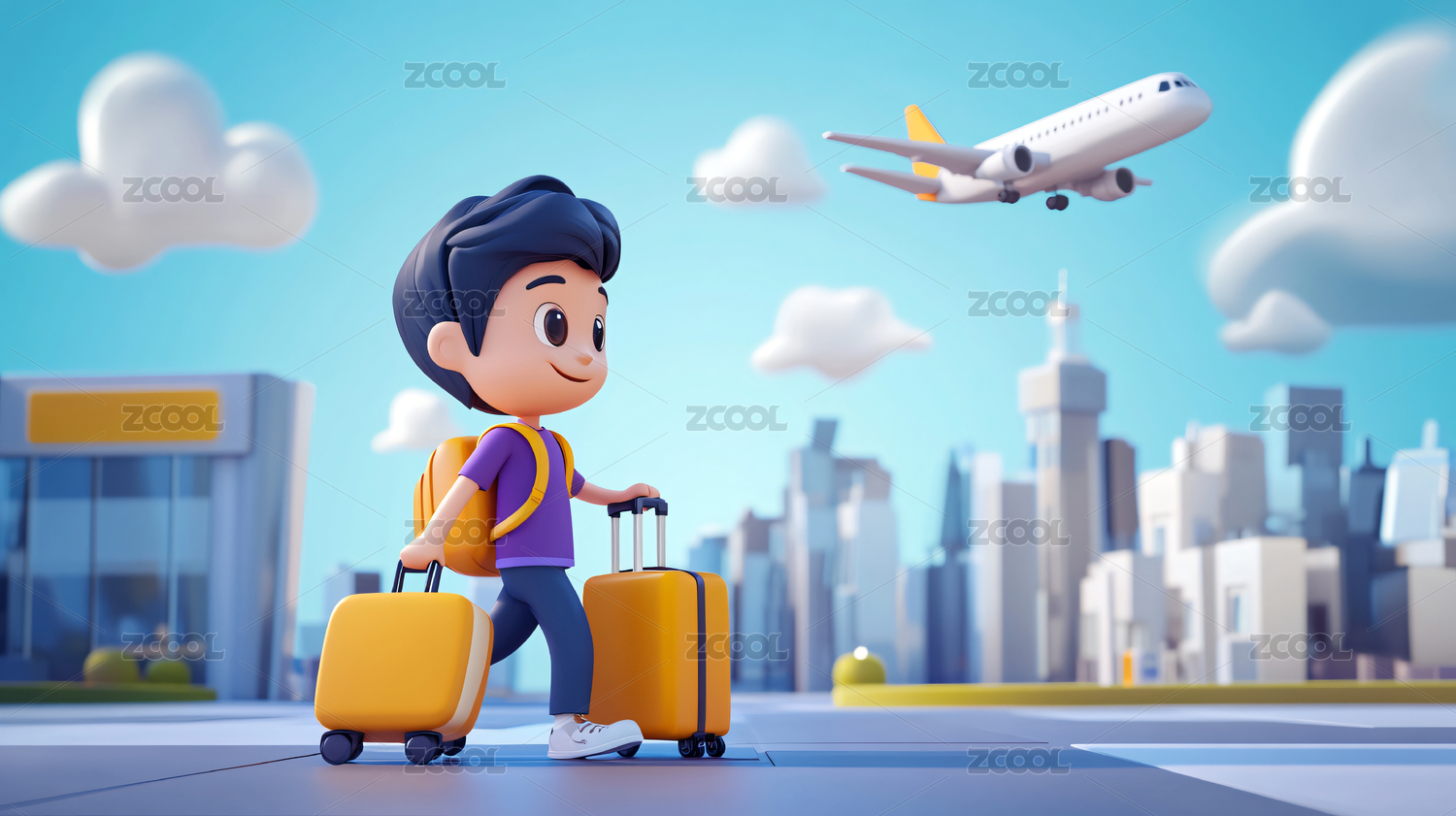 3D卡通男孩带着行李箱前往机场