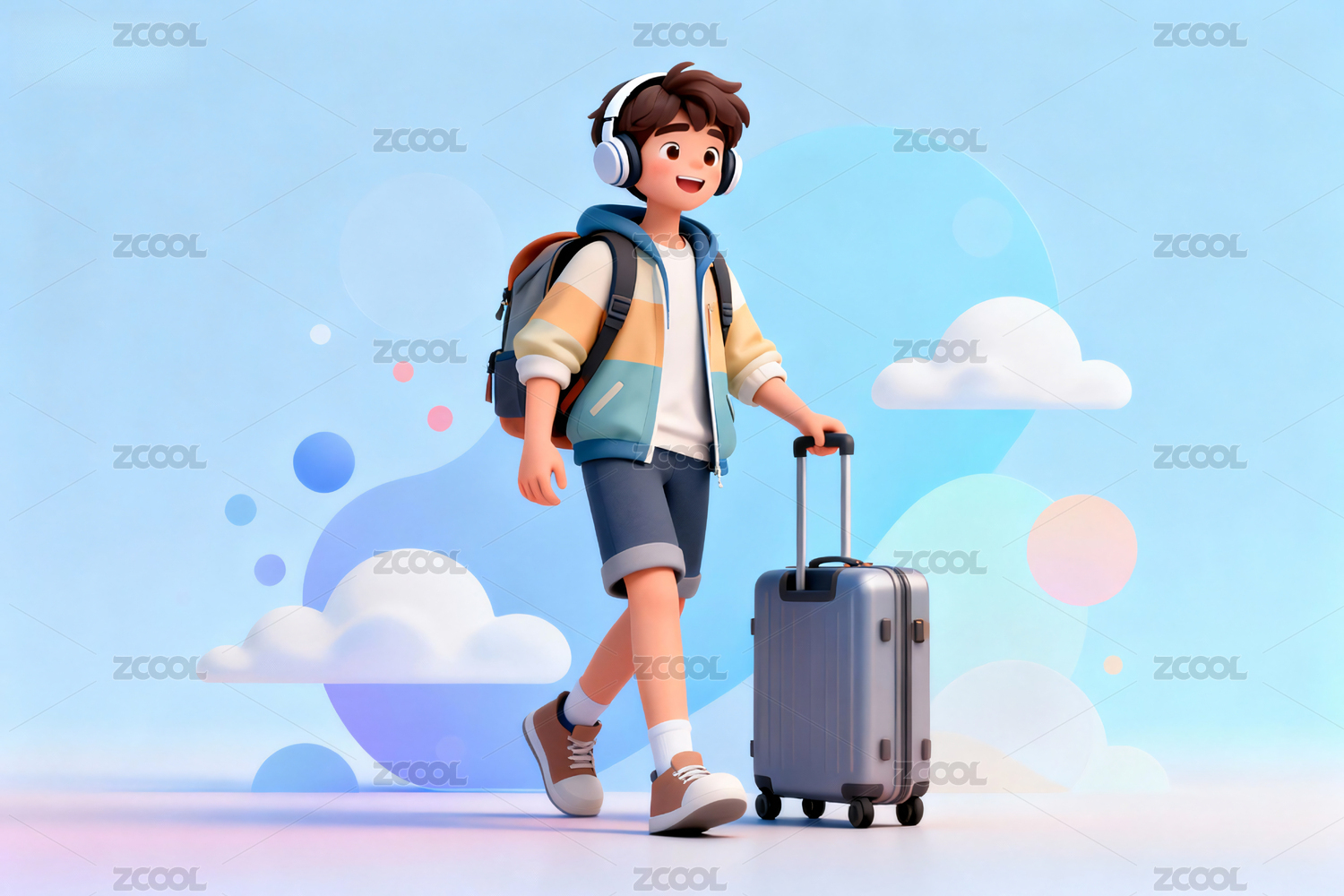 戴着耳机拉行李箱去旅行的男孩