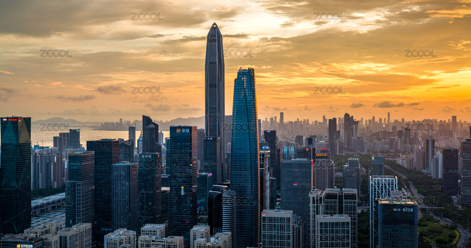 黄昏下的中国广东省深圳城市天际线建筑群高楼大厦风光