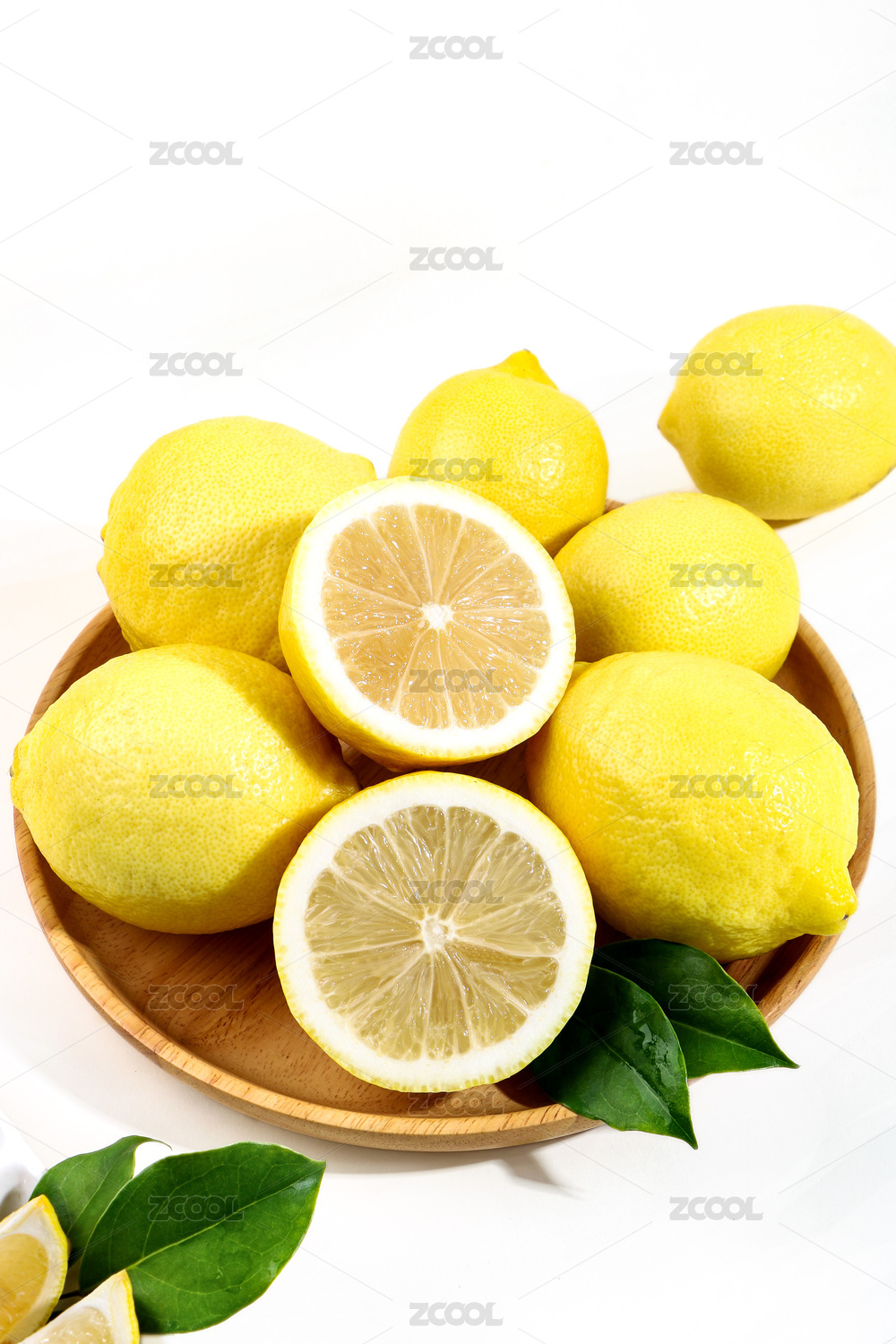 木板上放着一堆进口黄柠檬和一块切面黎檬