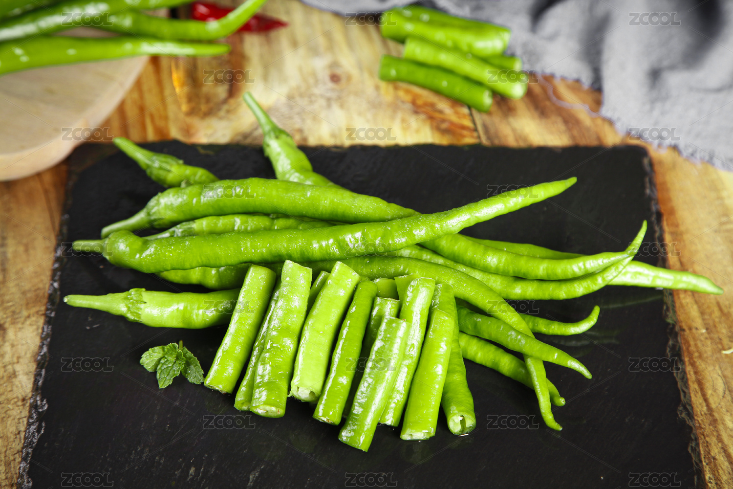 黑石板上放着青线椒和一碟切丁的青尖椒
