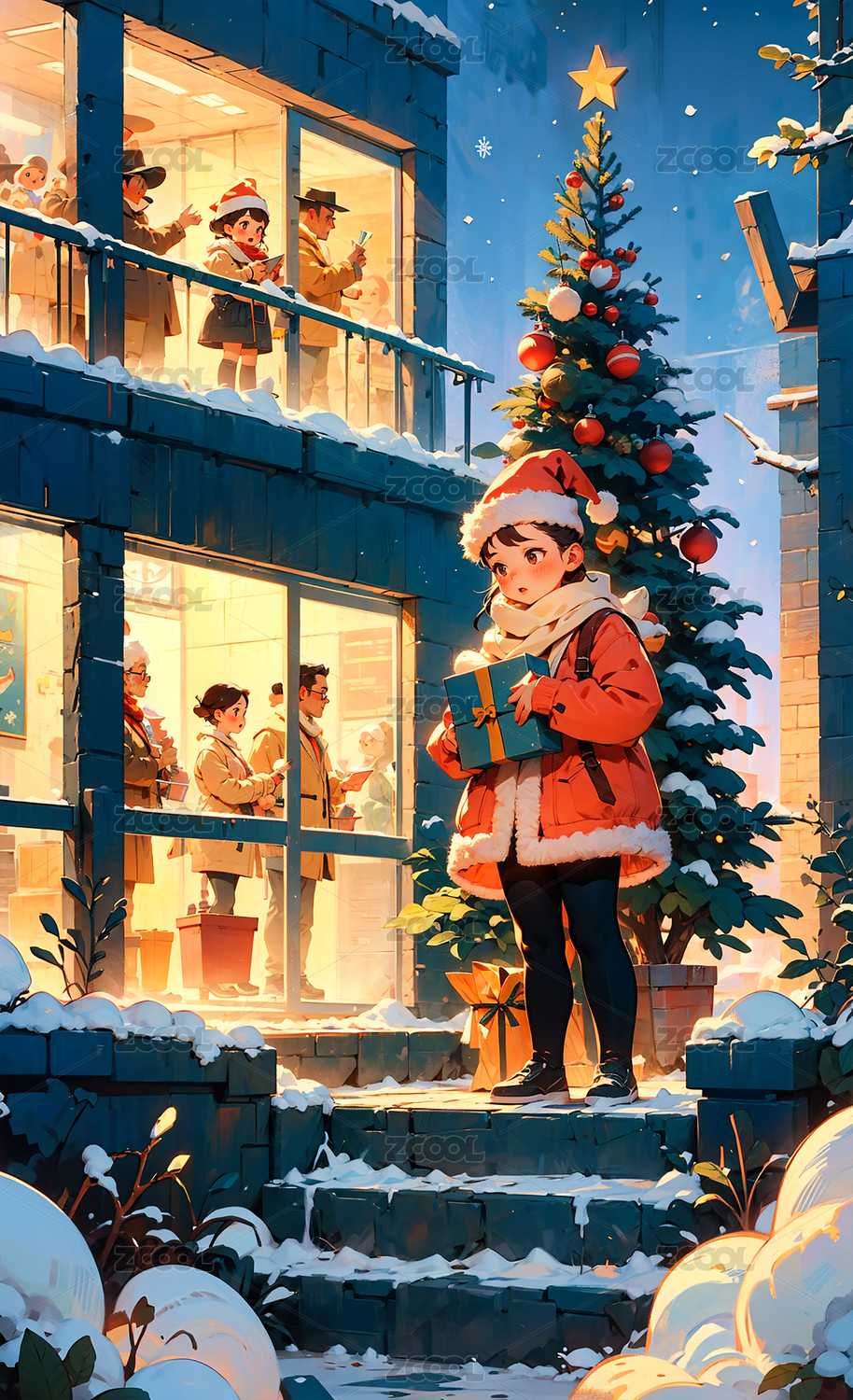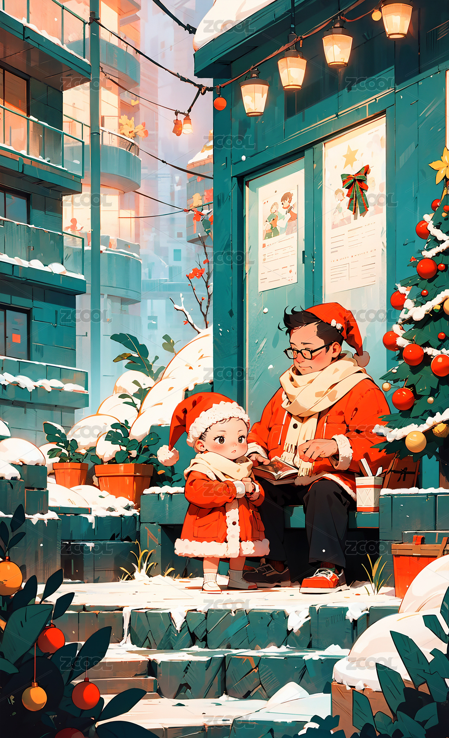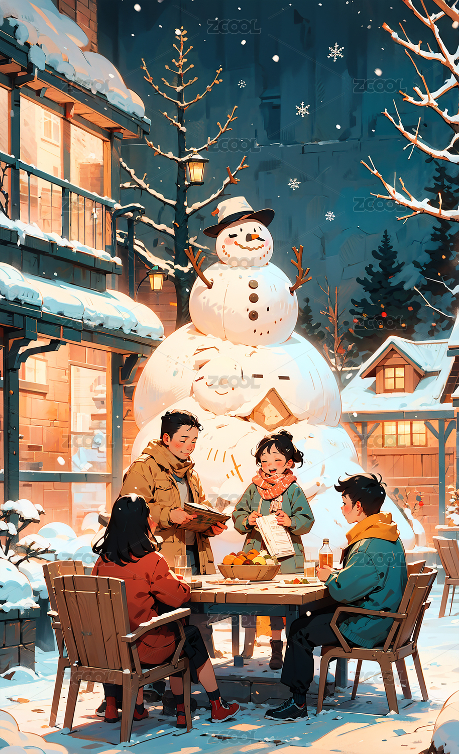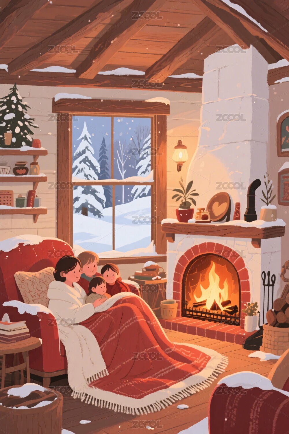 冬日下雪一家人在屋内温暖舒适生活场景插画