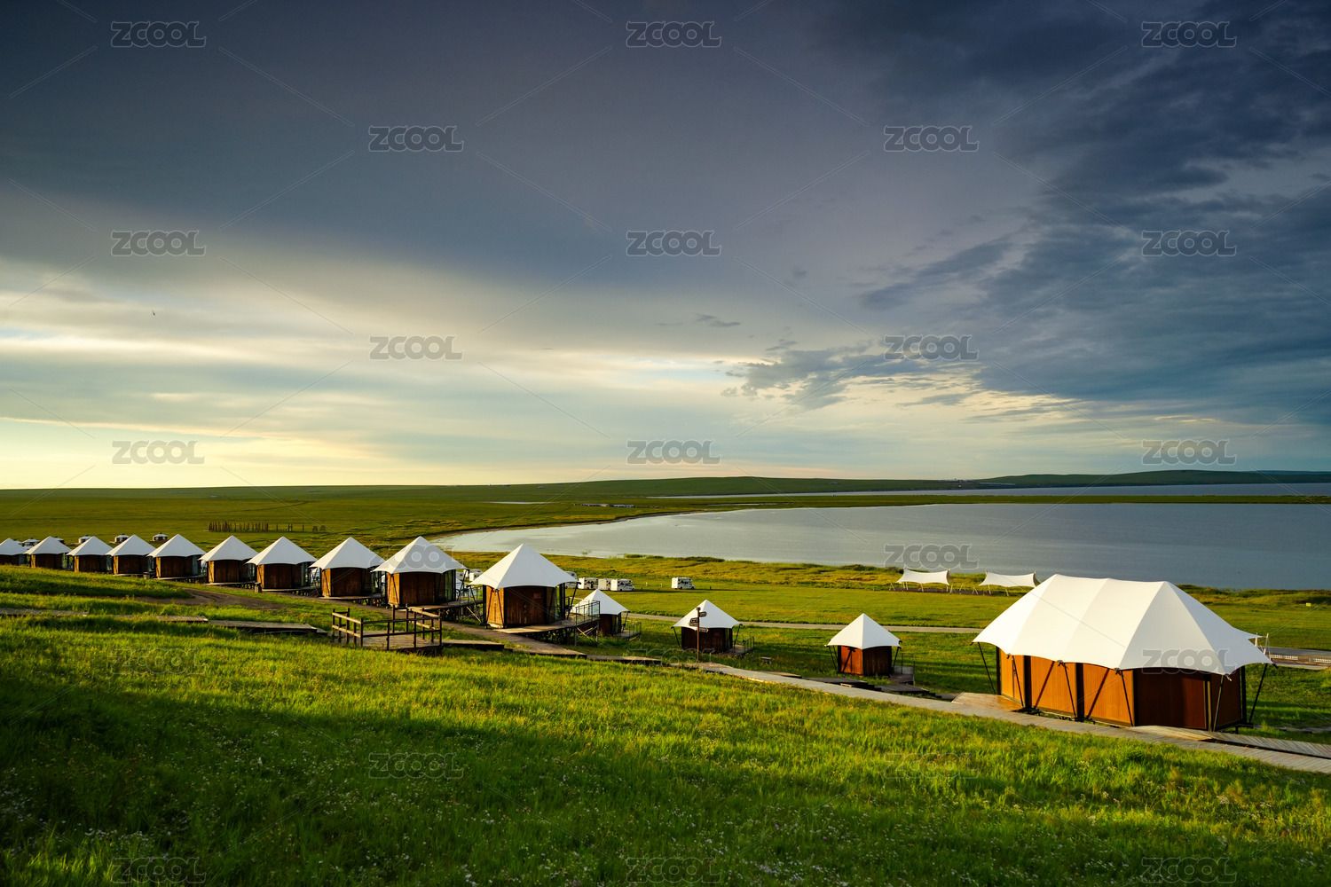 中国青海省海东县湖边草地上黄昏时刻的帐篷