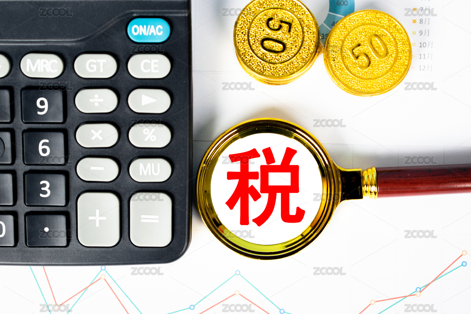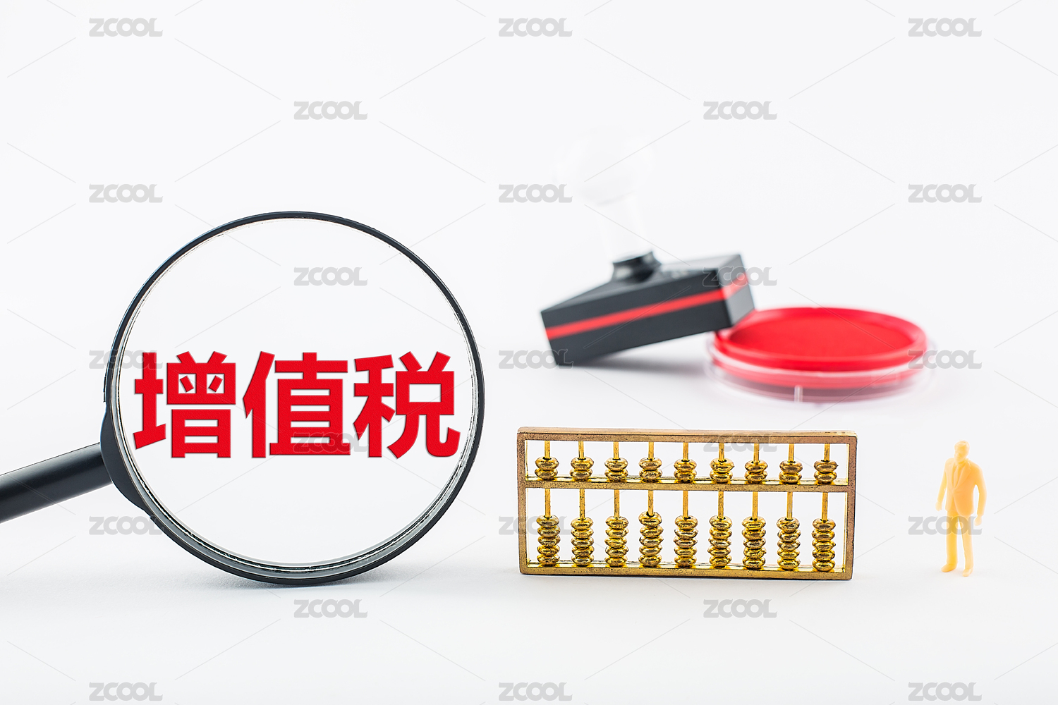 公章和放大镜,增值税计算概念图片。