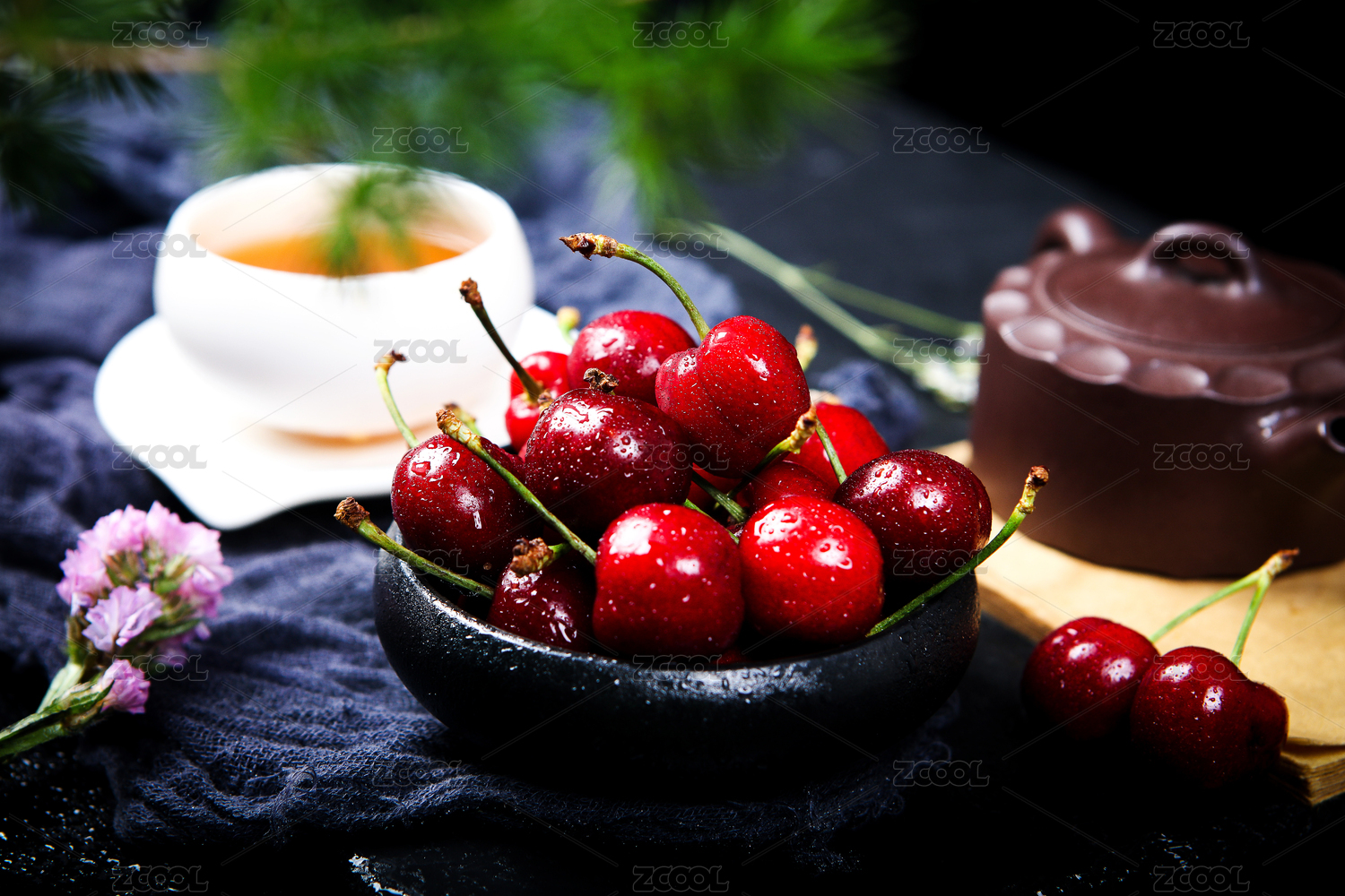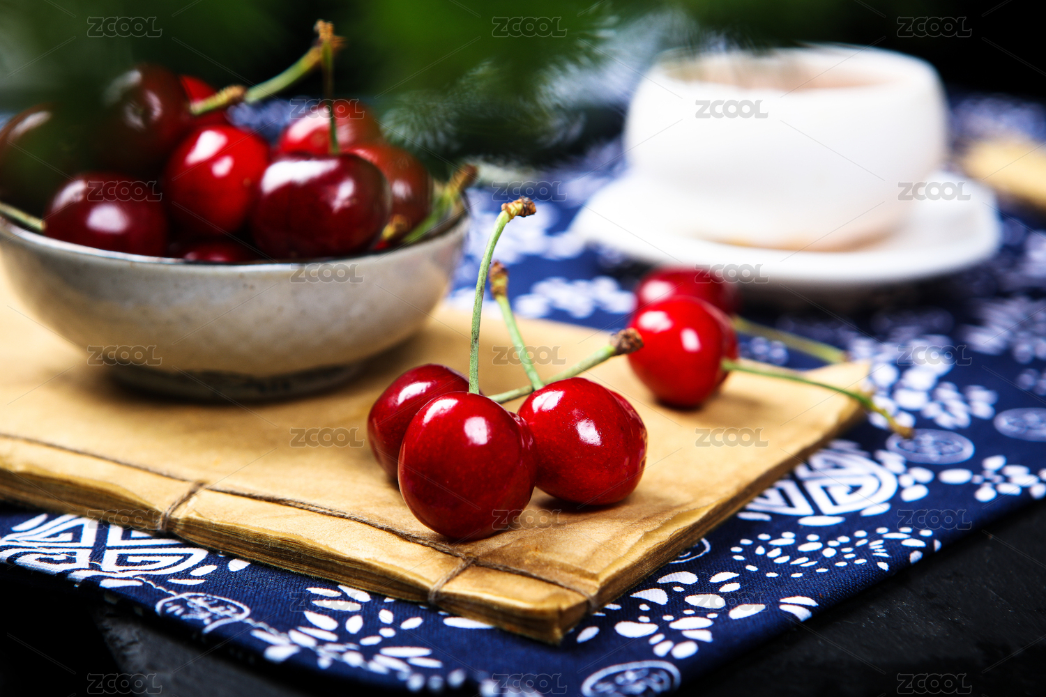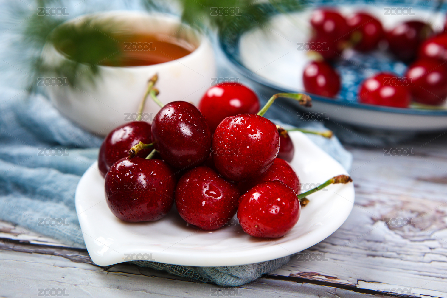 樱桃,车厘子,水果,棚拍,插花,桌面,木桌,一盘,一堆,碟子