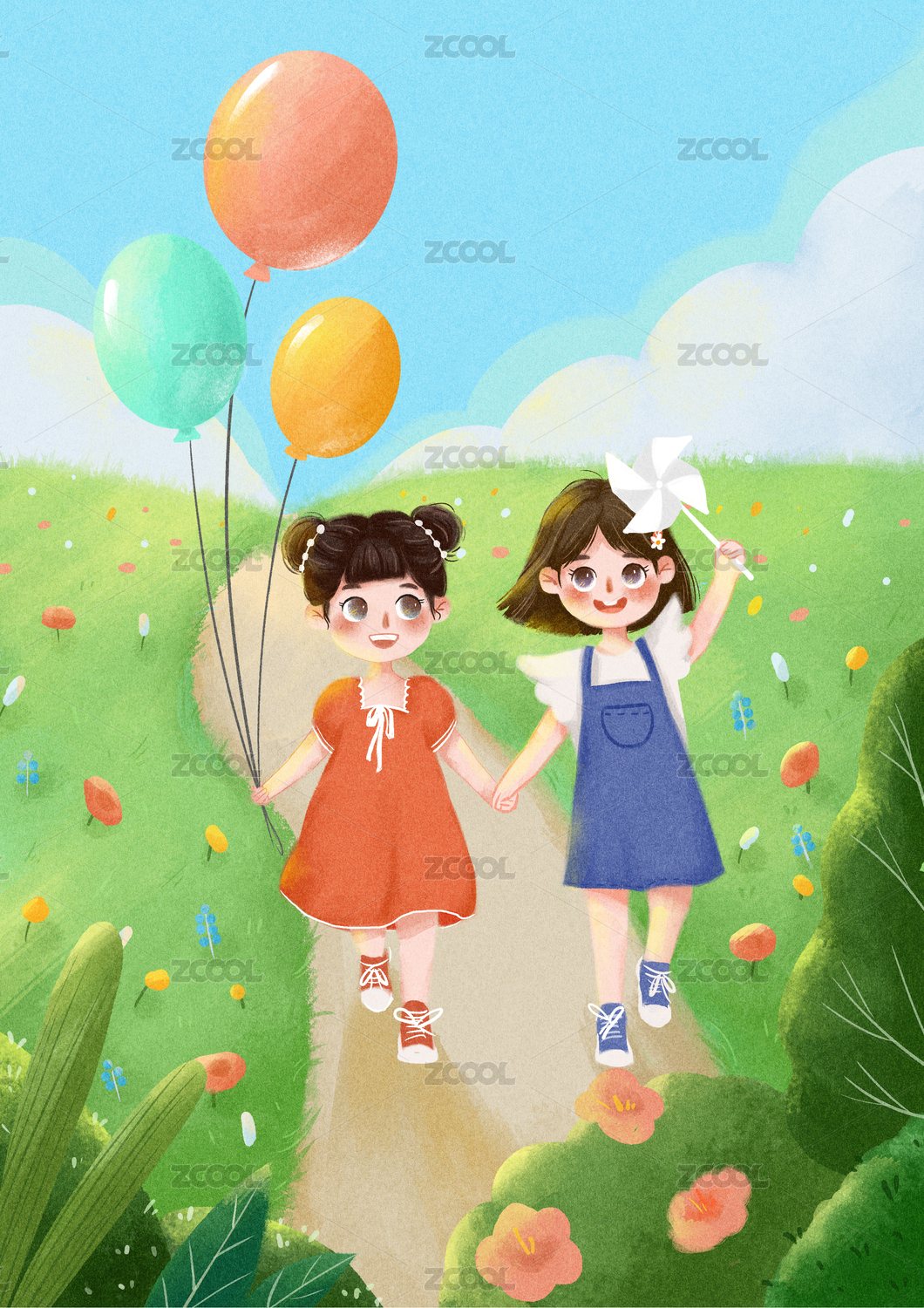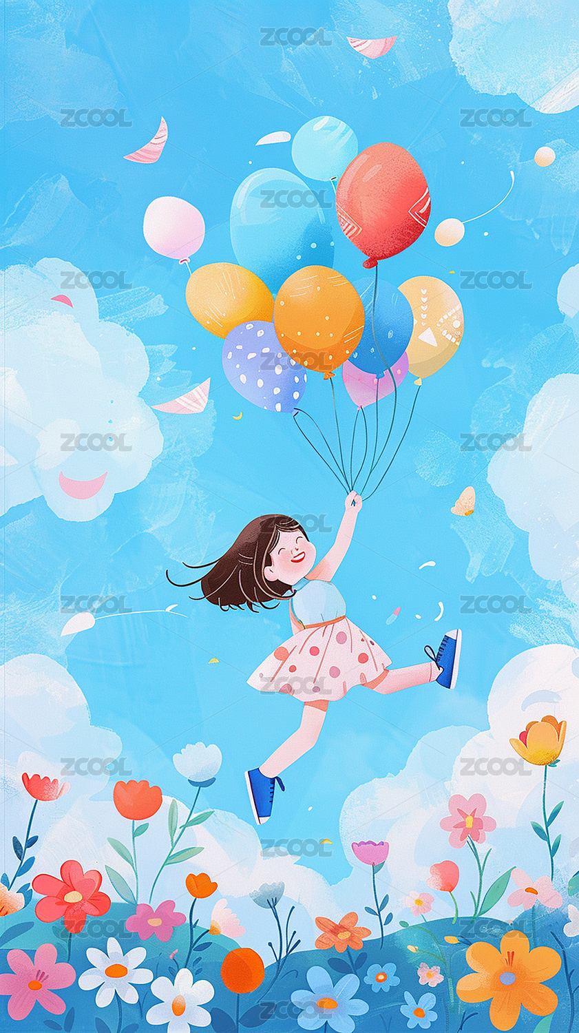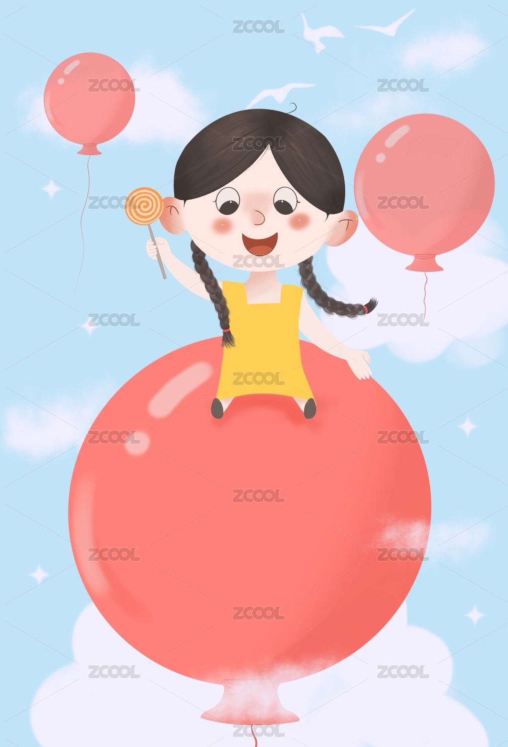 六一儿童节小孩玩气球插画快乐童年活动海报