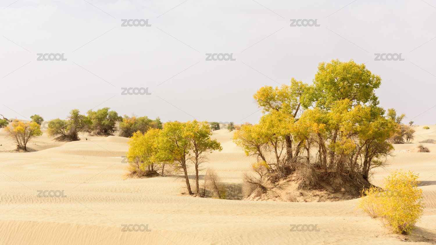 中国新疆南疆塔克拉玛干流动沙漠中金黄色的胡杨树