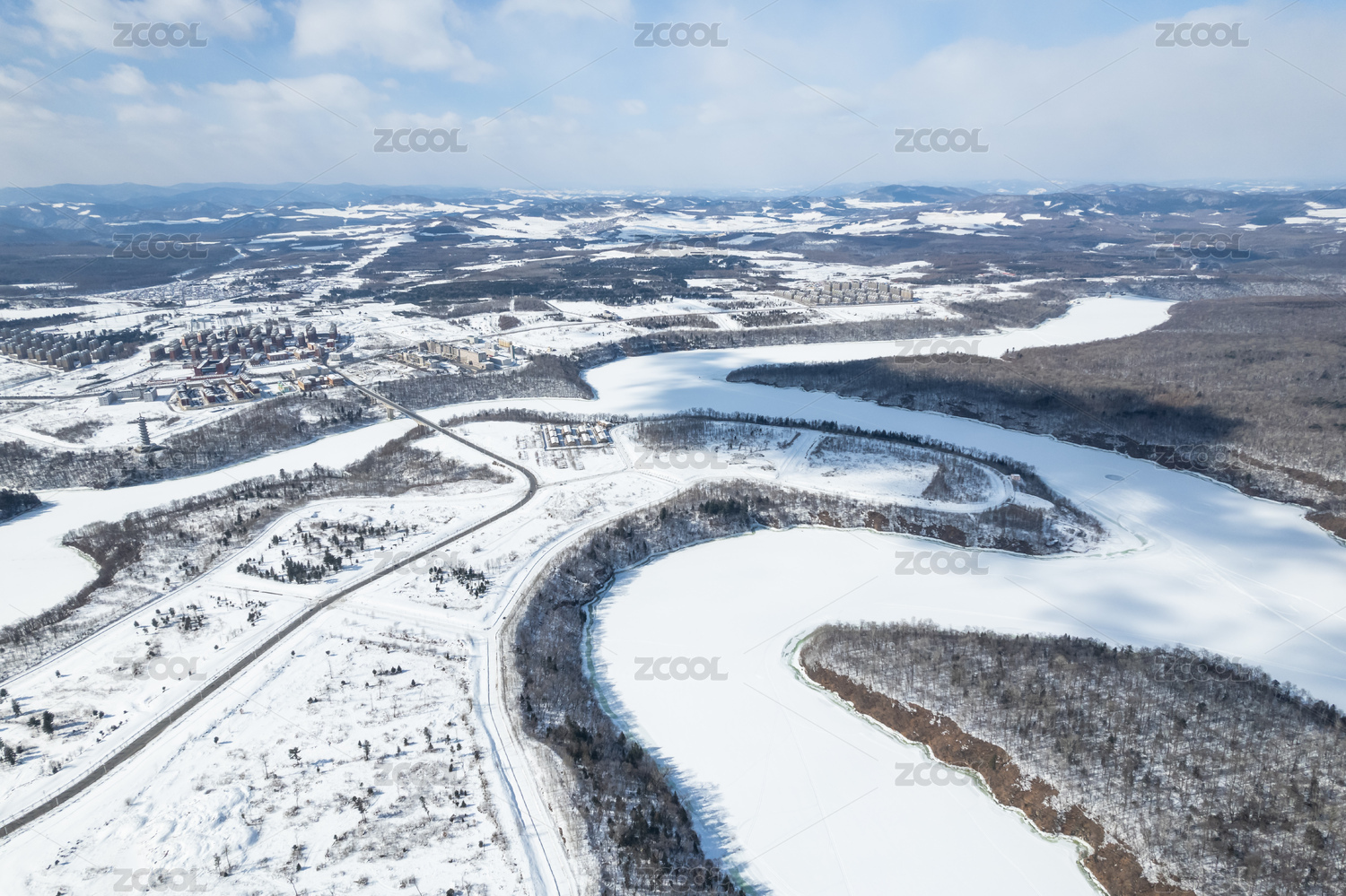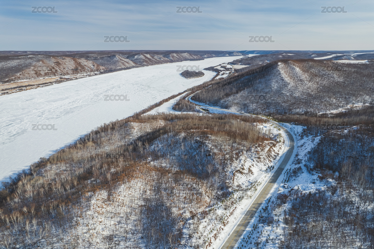 中国东北被大学冰封的河流 两旁是树林